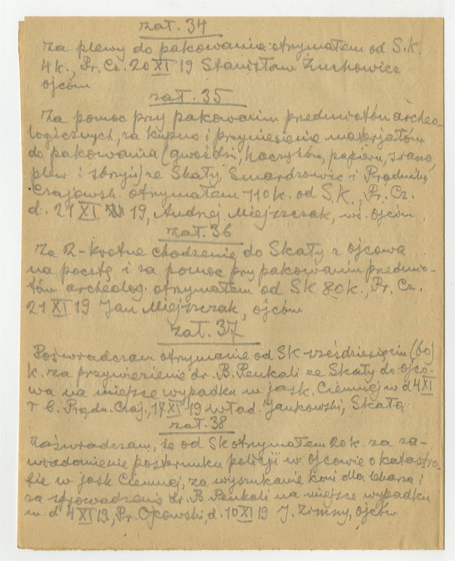 Rękopis notatek S. Krukowskiego zatytułowany "Kopje rachunków załączonych do sprawozdania z kamp. 1919 r." - strona 10: "zał. 34" … "zał. 38" (bez numeru strony)