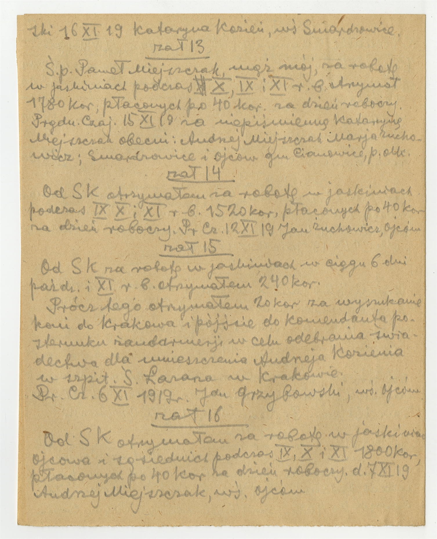 Rękopis notatek S. Krukowskiego zatytułowany "Kopje rachunków załączonych do sprawozdania z kamp. 1919 r." - strona 4: "zał. 13" … "zał. 16" (bez numeru strony)