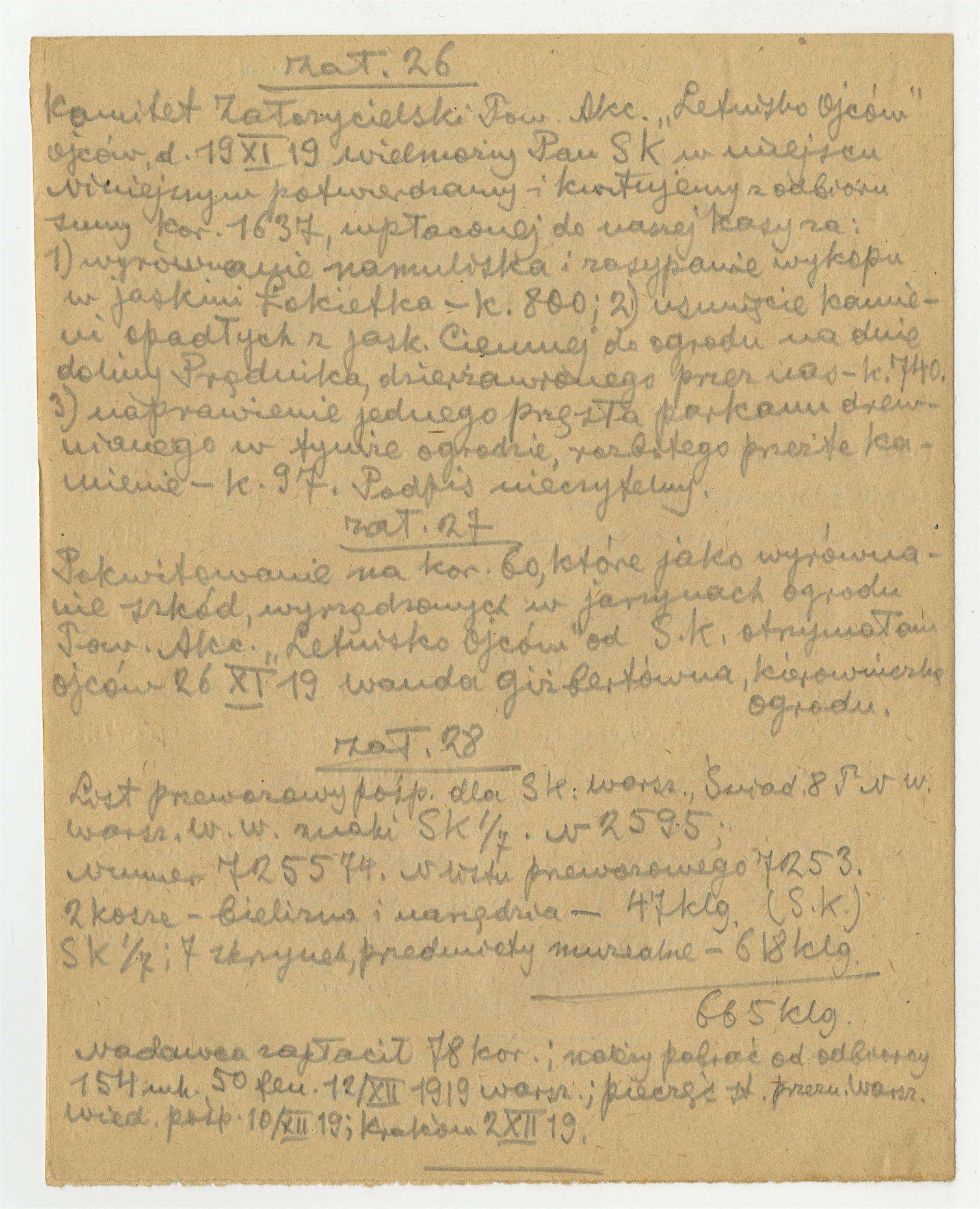 Rękopis notatek S. Krukowskiego zatytułowany "Kopje rachunków załączonych do sprawozdania z kamp. 1919 r." - strona 8: "zał. 26" … "zał. 28" (bez numeru strony)