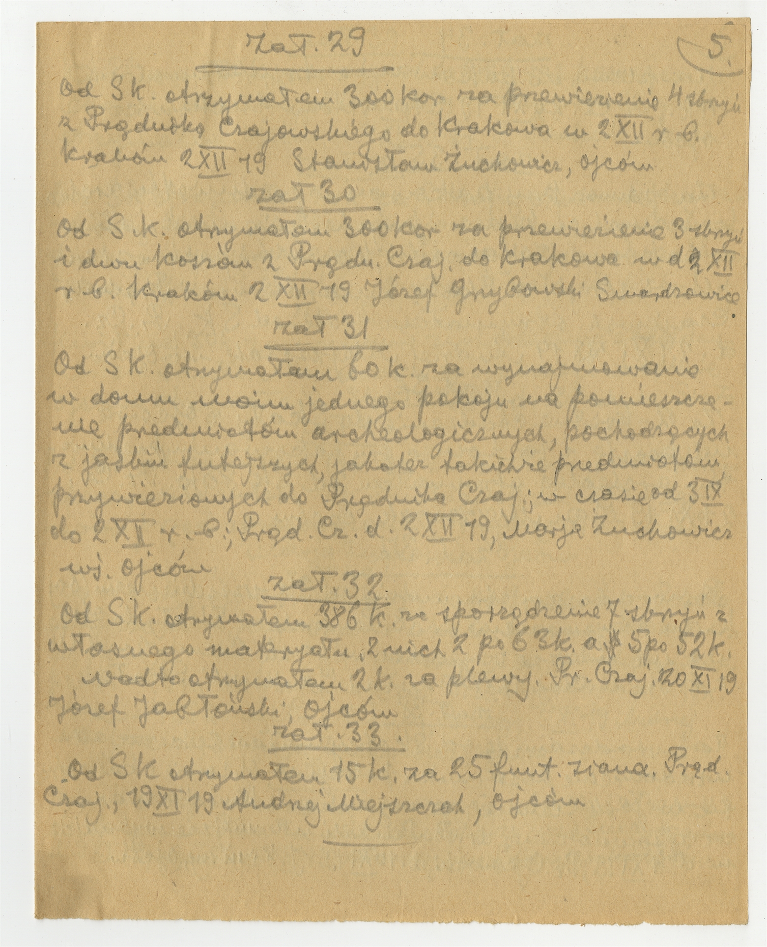Rękopis notatek S. Krukowskiego zatytułowany "Kopje rachunków załączonych do sprawozdania z kamp. 1919 r." - strona 9: "zał. 29" … "zał. 33" (autorska strona 5)