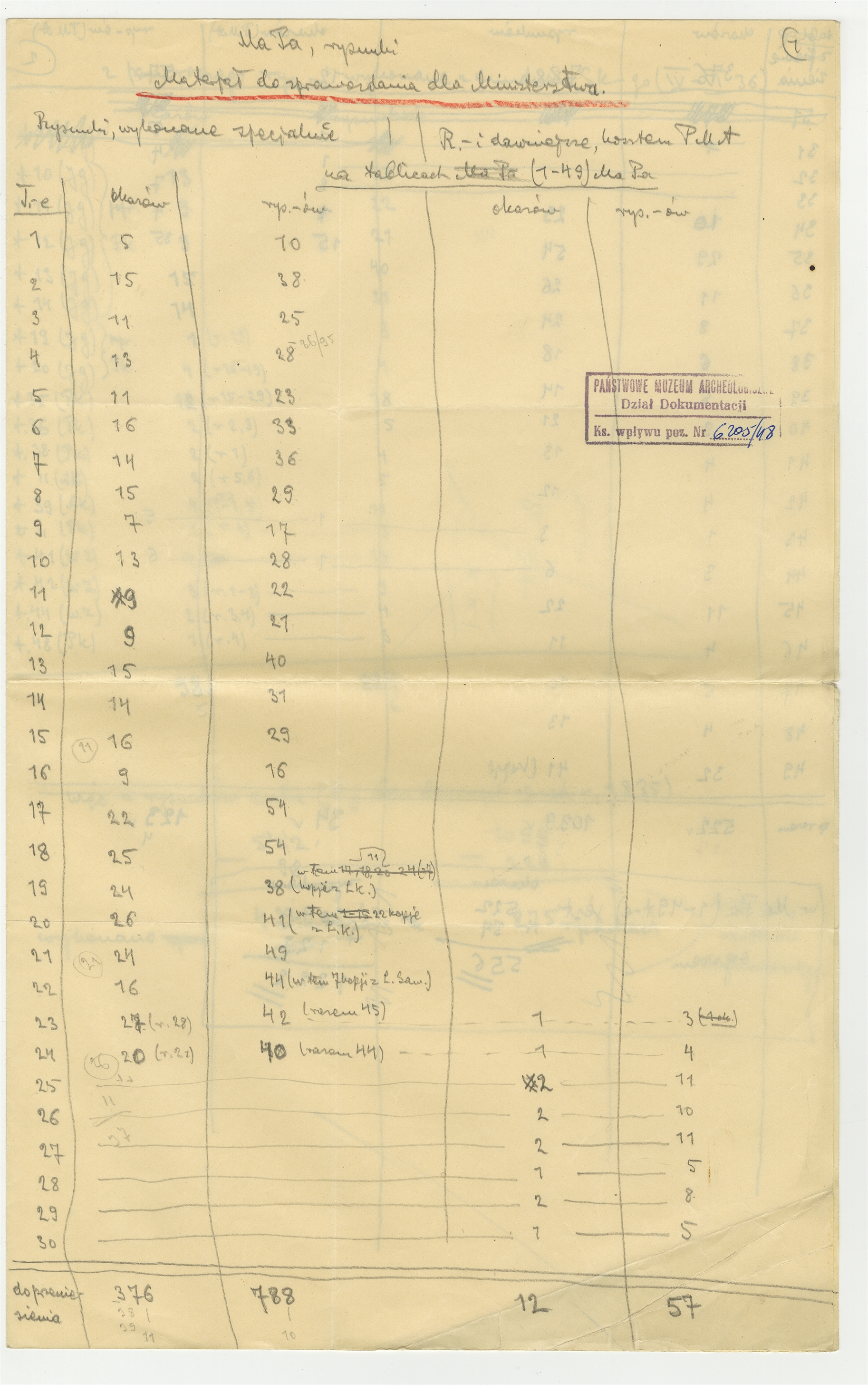 Rękopis notatek S. Krukowskiego zatytułowany "Materiały do sprawozdania dla Ministerstwa" - strona 1: tabelka - pozycje 1 - 30 (autorska strona 1)