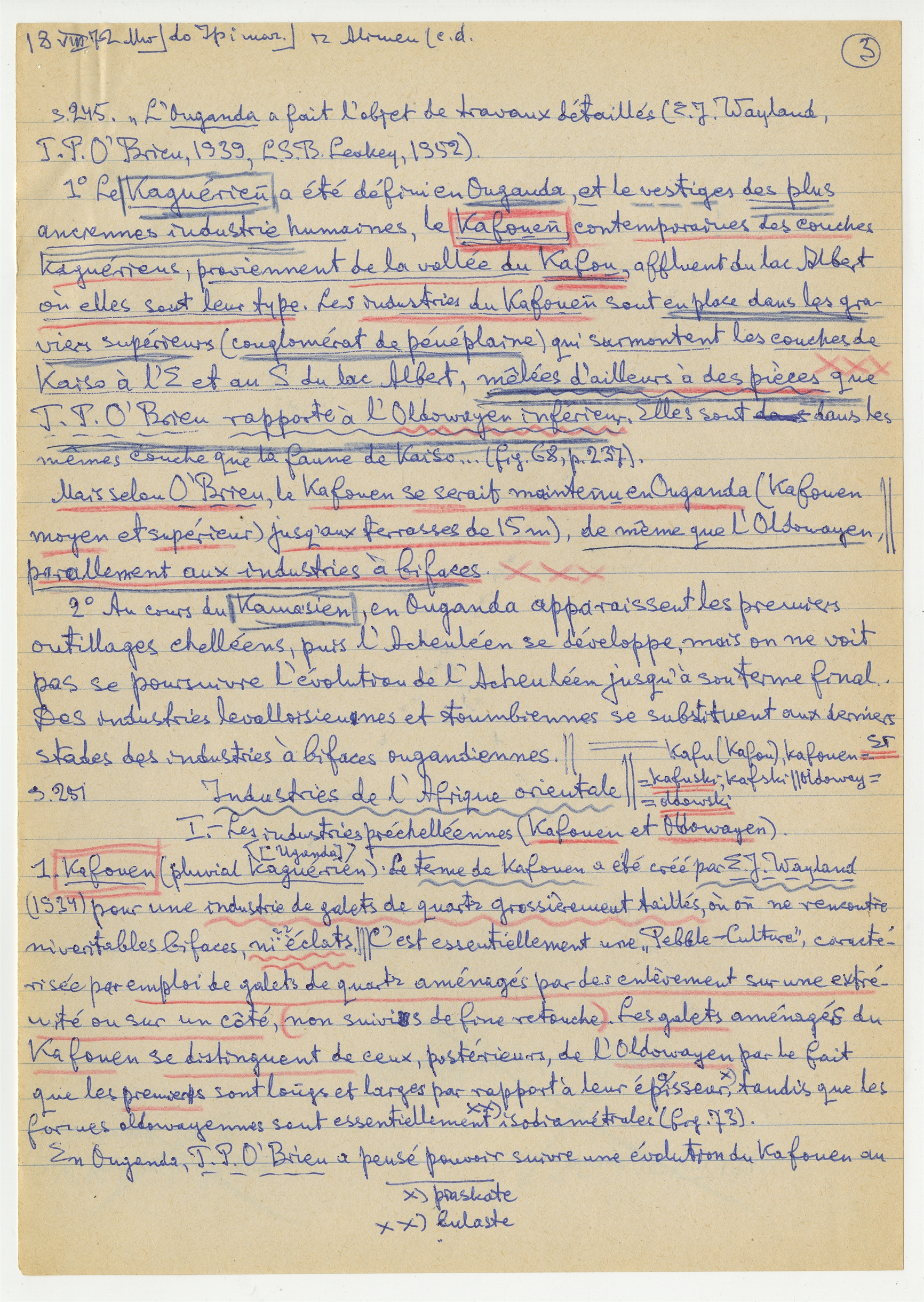 Rękopis notatek S. Krukowskiego zatytułowany "Z Alimen" - strona 4: zatytułowana "do Ip i maz" - "z Alimen (c.d.) zawiera notatki z publikacji - "L'Ouganda a fait l'object de travaux detaillés (E.J. Wayland T.P.O'Brien 1939 L.S.B. Leakey 1952) dotyczące stron s.245 s.251 18 VIII [19]72 (autorska strona 3)