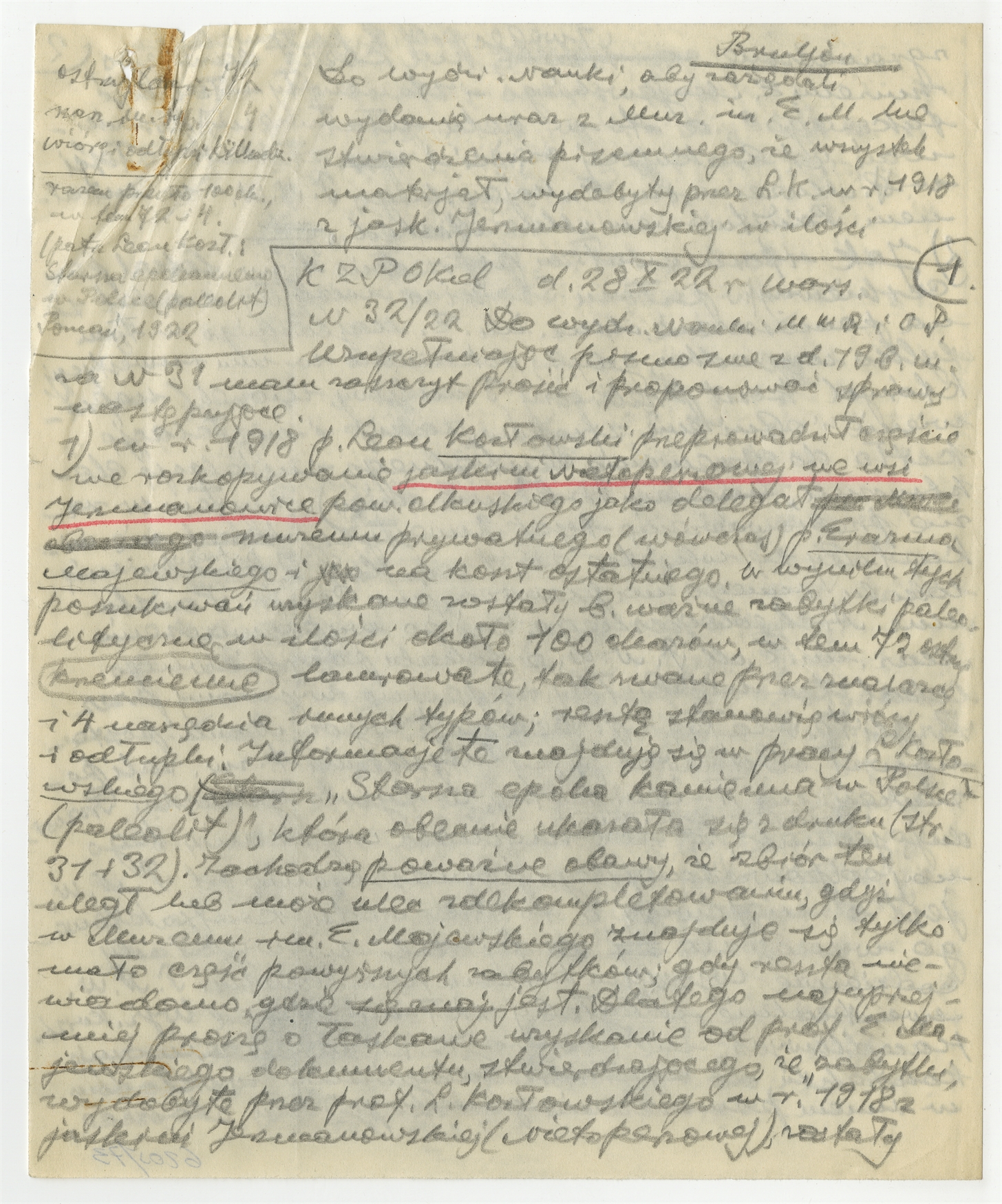 Rękopis – notatka dot. „Jaskini Nietoperzowej” 28 października 1922 r. autorska numeracja: 1 str. 1