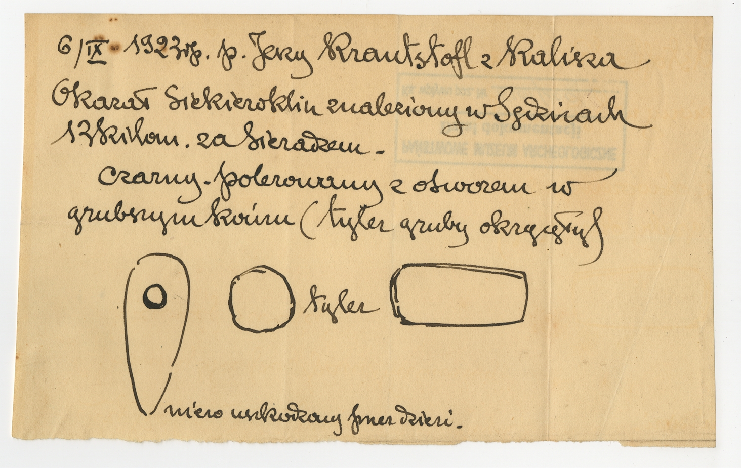 Rękopis - notatka Jerzego Wawrzenieckiego z dnia 6 IX 1923 roku o znalezisku Jerzego Krautstoff w Sędzinach koło Sieradza