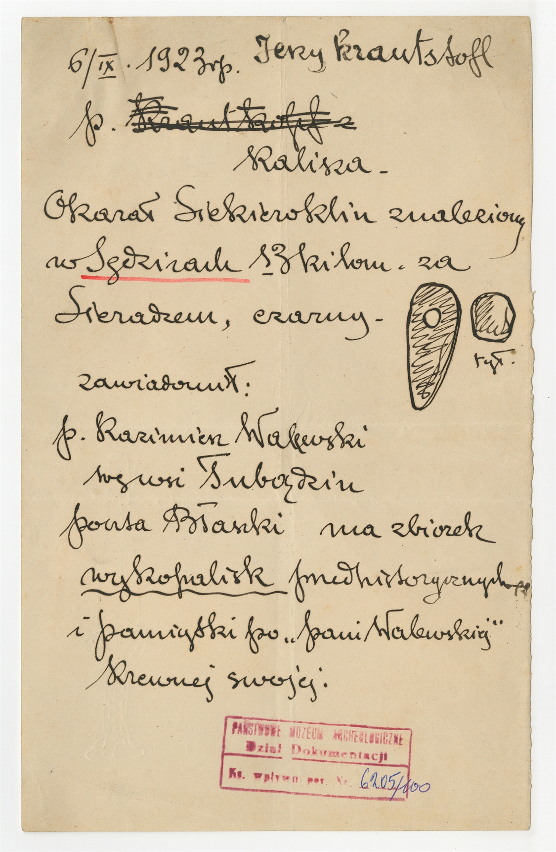 Element 1 - Rękopis - notatka Jerzego Wawrzenieckiego z dnia 6 IX 1923 roku o znalezisku Jerzego Krautstoff w Sędzinach oraz o zbiorach Kazimierza Walewskiego wTubądziu
