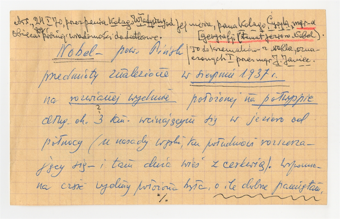 Rękopis - notatka ręką NN (p. Kolago?) dotycząca znalezisk w Noblu w sierpniu 1937 roku. Ręką S. Krukowskiego dopisek z dnia 24 I [19]70 roku dotyczący notatki: "przez panią Kolago Władysławy od jej męża…"