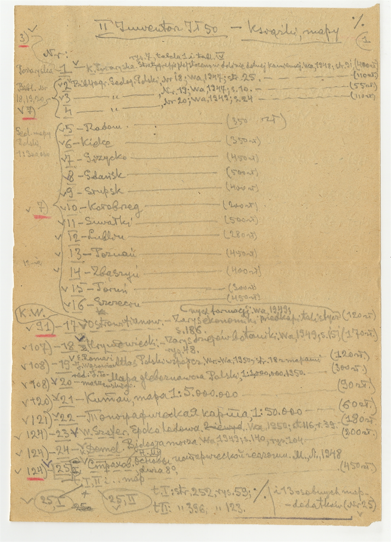 Rękopis - notatka S. Krukowskiego z dnia 11 I [19]51 roku: II inwentarz IT 50 - ksiażki mapy - strona 1