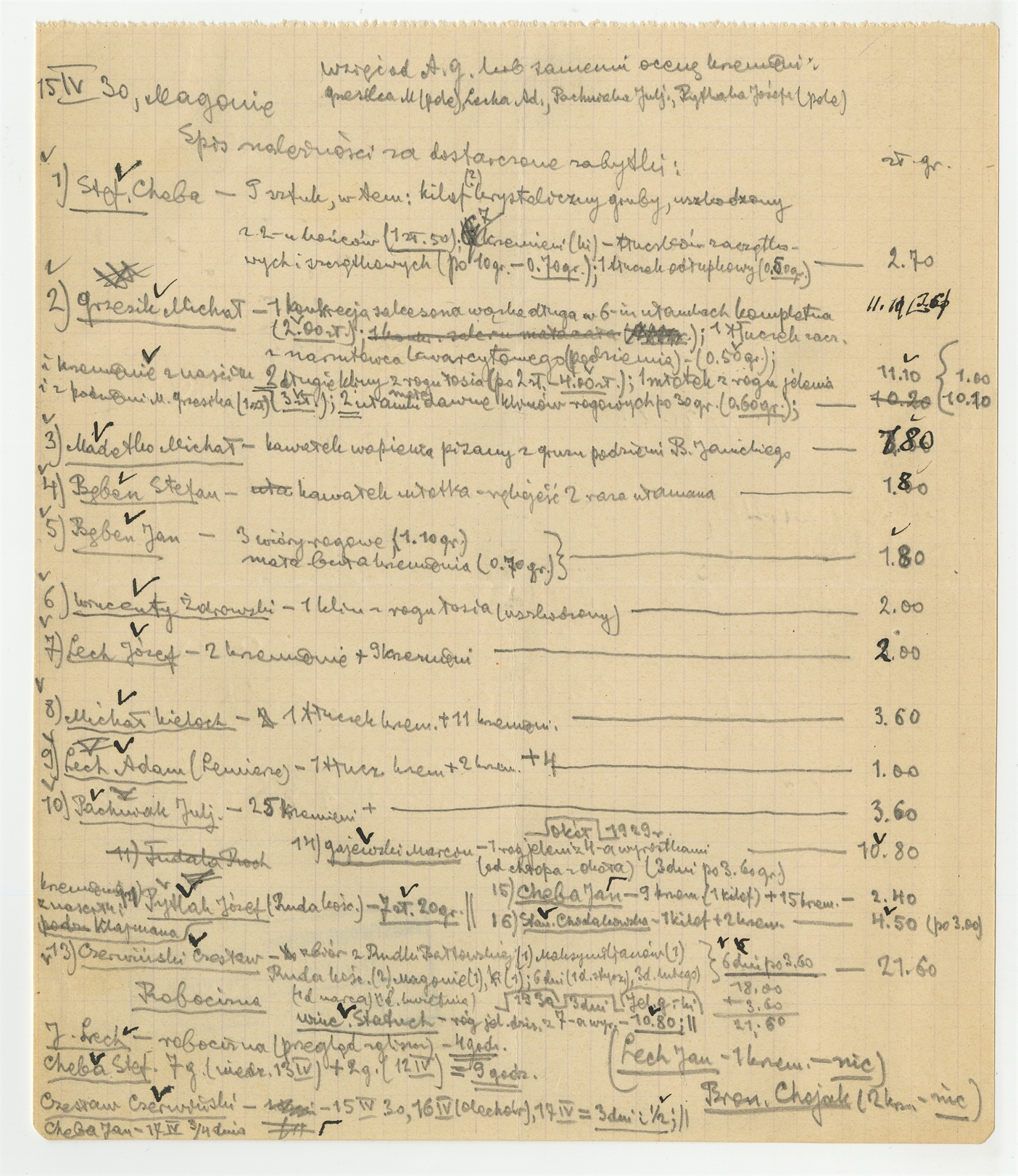 Rękopis - notatka Stefana Krukowskiego z dnia 15 IV [19]30 roku ze spisem "należności za dostarczone zabytki"