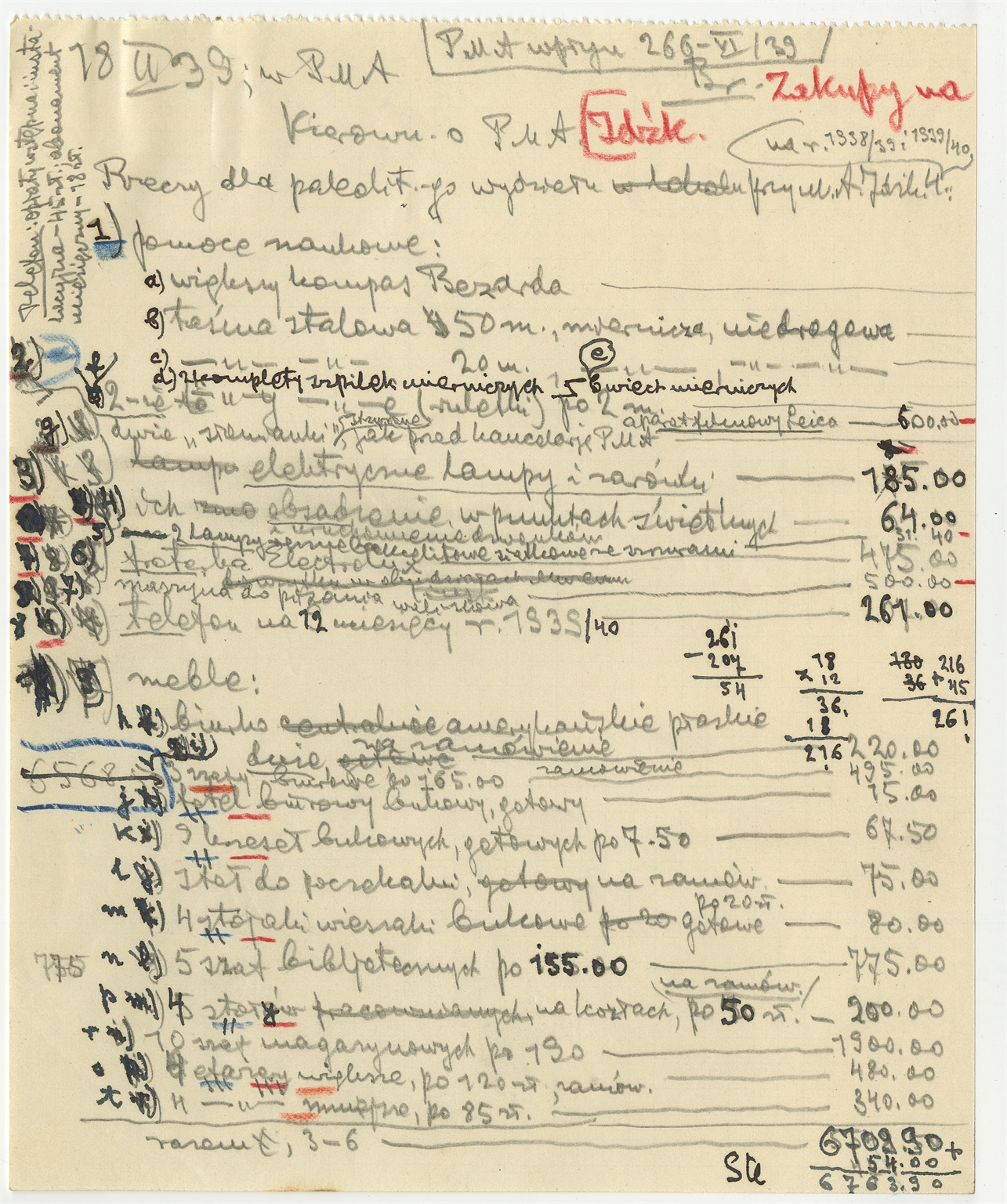 Rękopis - notatka Stefana Krukowskiego z dnia 18 II [19]39 roku z listą zakupów dla wydziału paleolitycznego