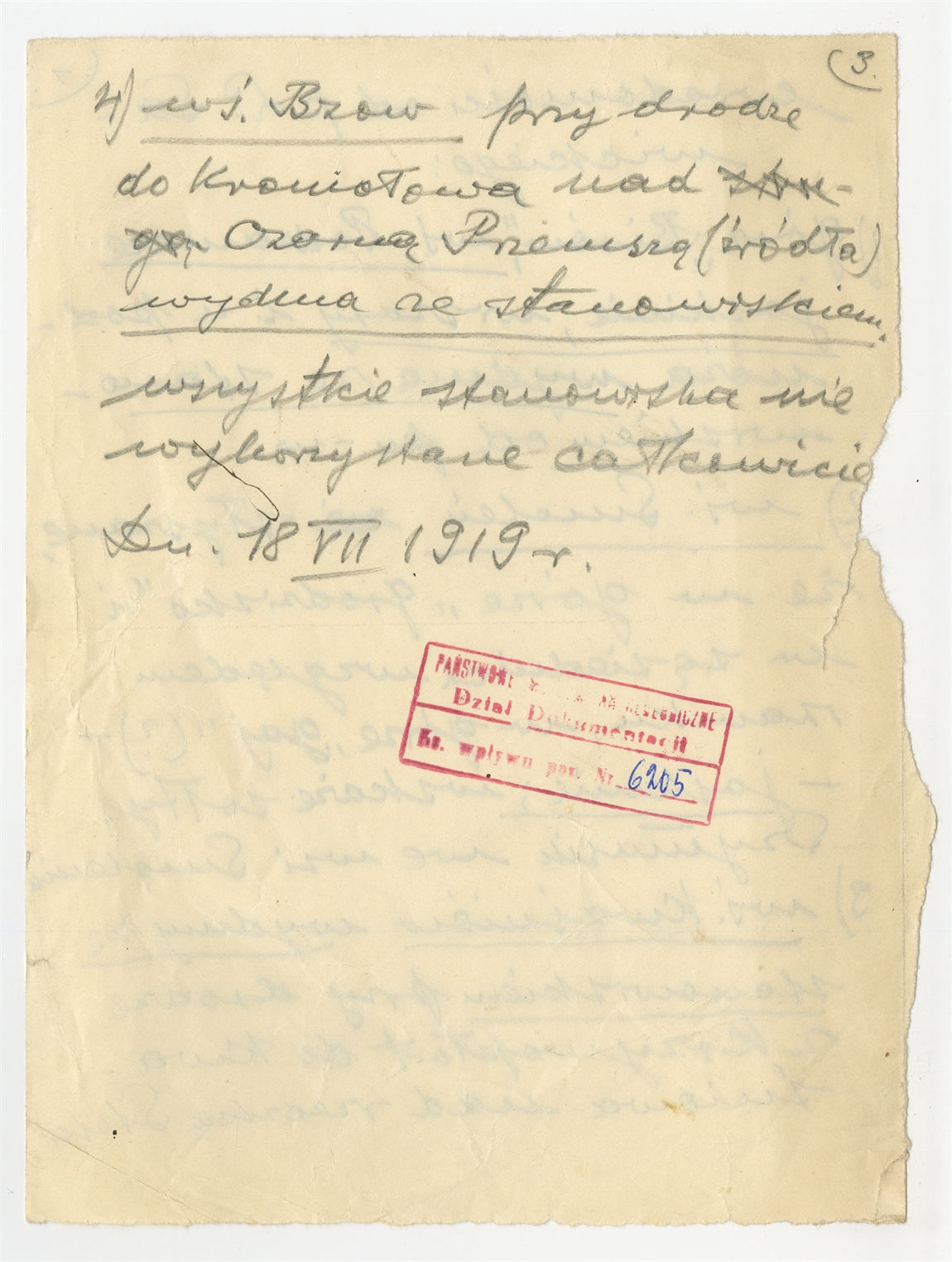 Rękopis - notatka Stefana Krukowskiego z dnia 18 VII 1919 roku z informacją od L.Sawickiego o stanowiskach we wsiach Podzamcze Smoleń Kwaśniów i Bzów (cd)