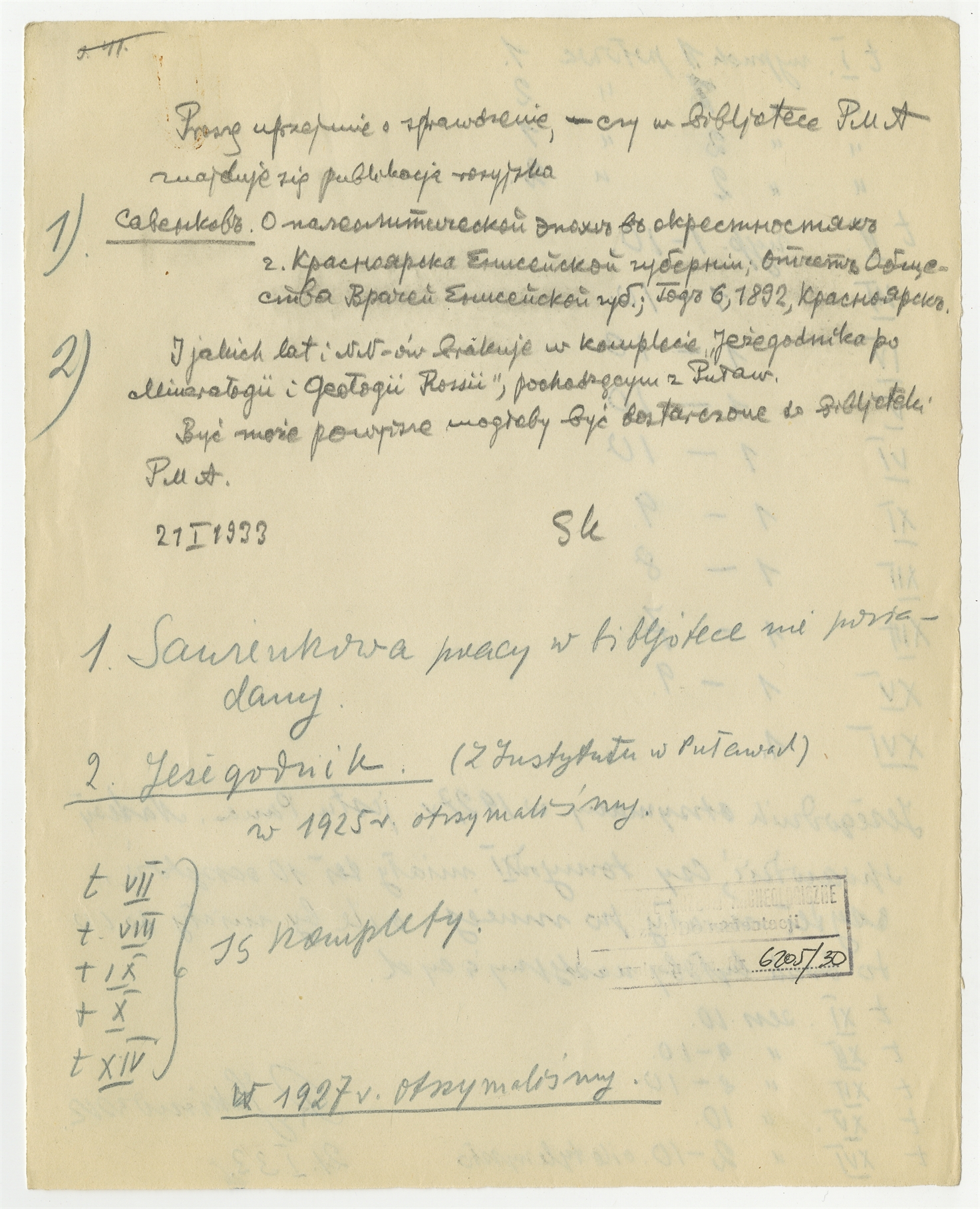 Element 1 - Rękopis - notatka Stefana Krukowskiego z dnia 21 I 1933 z pytaniem do Romana Jakimowicza wraz z odpowiedzią Romana Jakimowicza