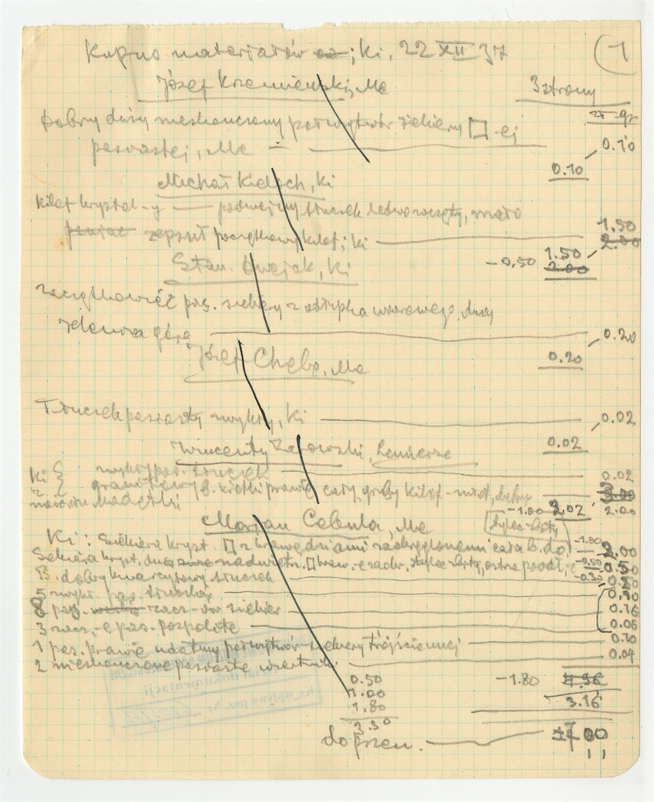 Rękopis - notatka Stefana Krukowskiego z dnia 22 XII [19]37 roku: "Kupno materiałów". Lista zabytków i ich wycena. Strona 1