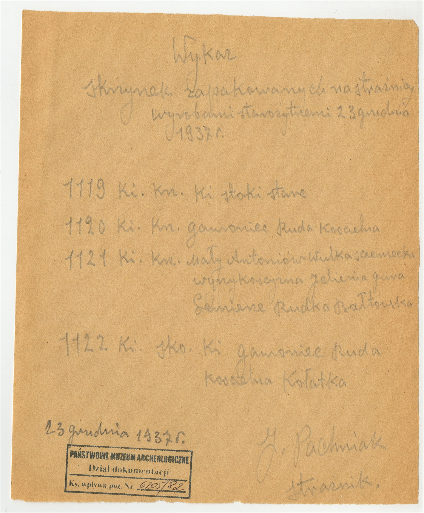 Rękopis - notatka Stefana Krukowskiego z dnia 23 grudnia 1937 roku z wykazem "skrzynek zapakowanych na strażnicy wyrobami starożytnemi"