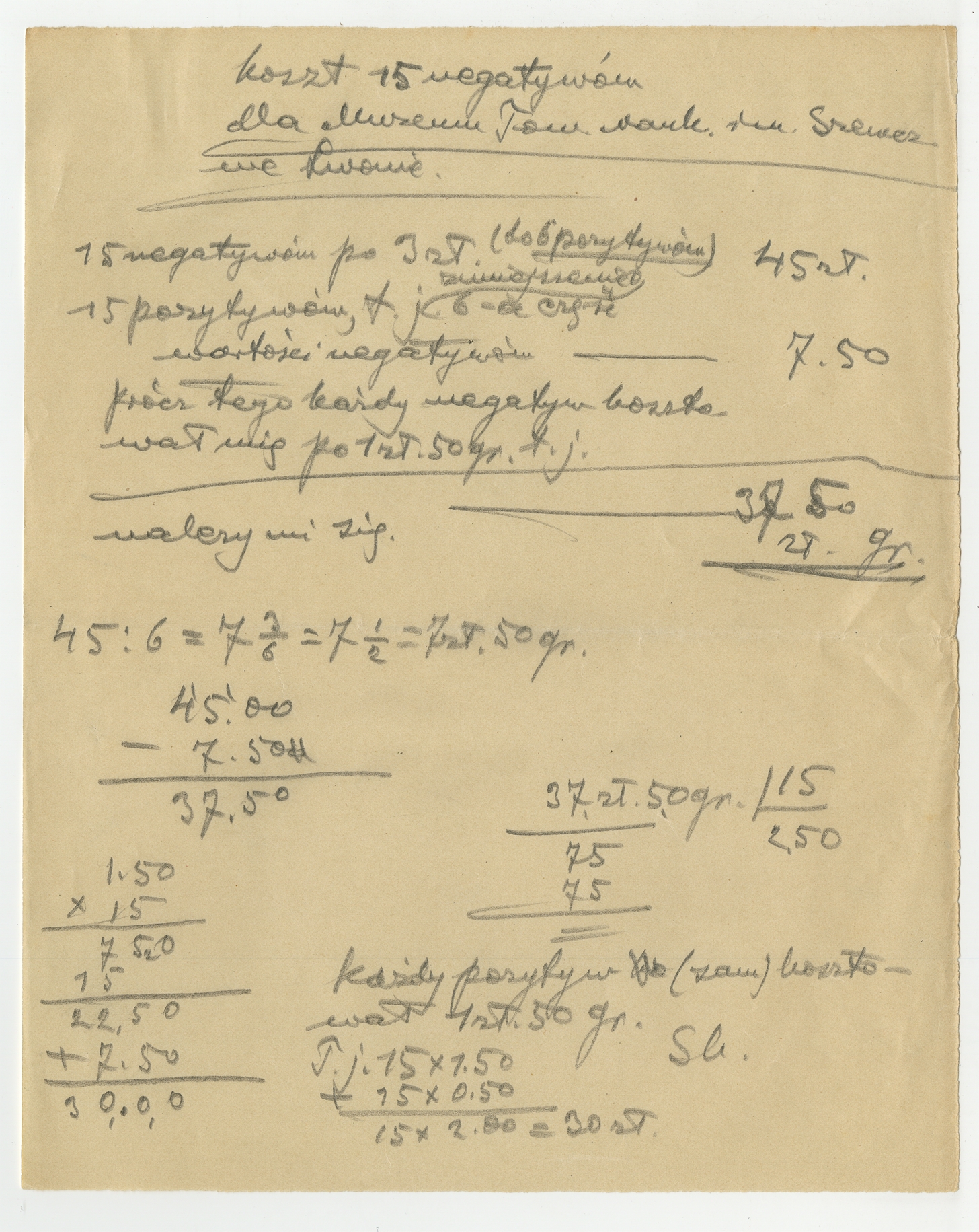Rękopis - notatka Stefana Krukowskiego z kosztorysem dla Muzeum im T.Szewczenki we Lwowie