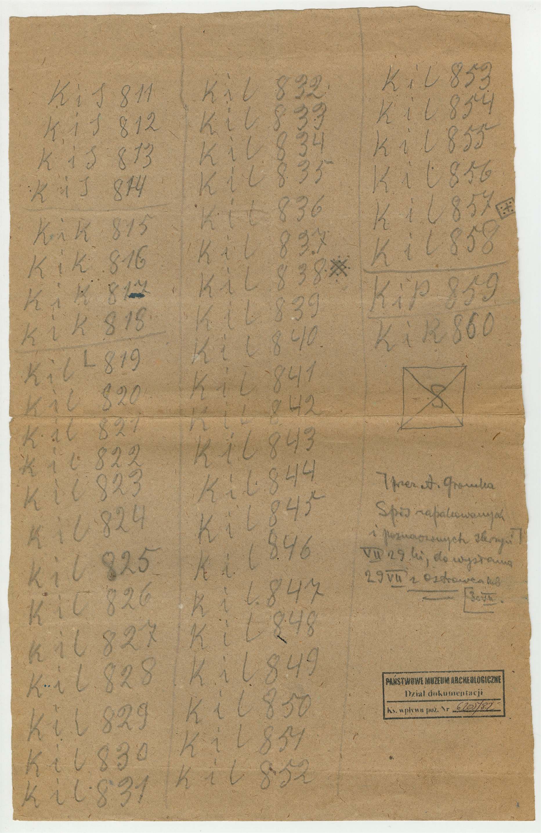 Rękopis - notatka Stefana Krukowskiego z VII [19]29 roku ze spisem numerów skrzyń "zapakowanych i poznoszonych […] do wysłania 29 VII z Ostrowca"