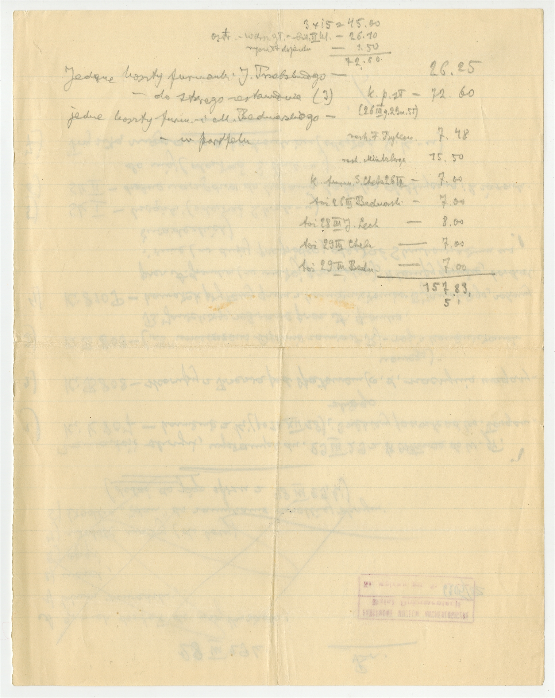 Rękopis - notatka Stefana Krukowskiego z zestawieniem kosztów furmanek i biletów kolejowych