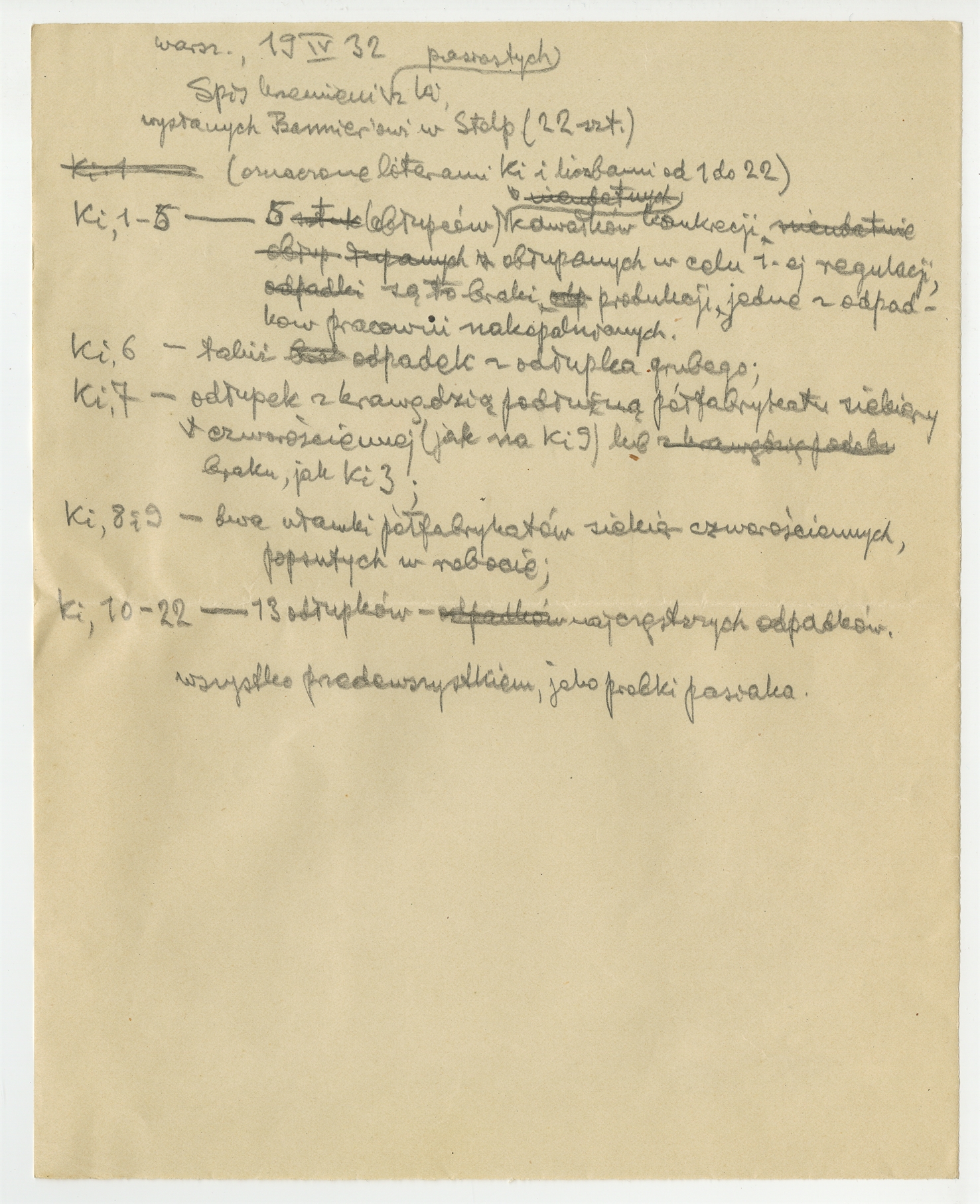 Rękopis - notatka Stefana Krukowskiego ze spisem krzemieni z dn. 19 IV 1932 r.