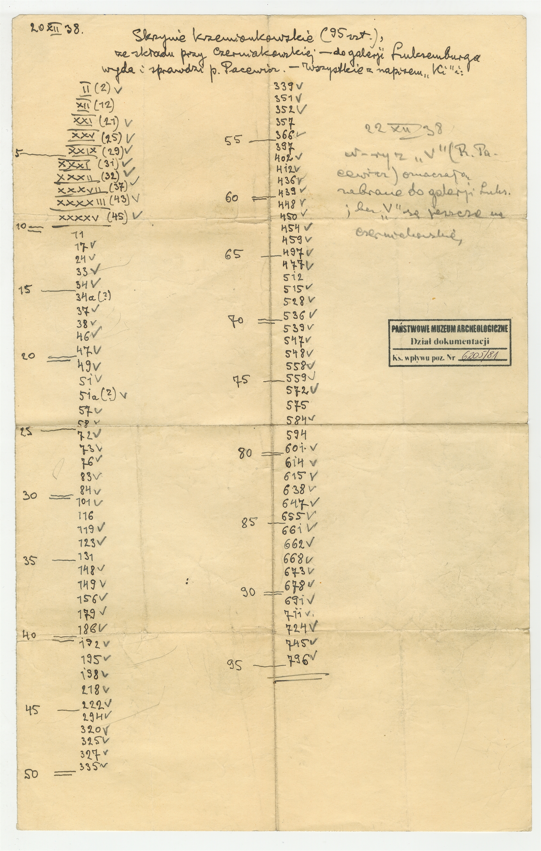 Rękopis - notatka Stefana Krukowskigo z dnia 20 XII [19]38 roku z wykazem skrzyń krzemionkowskich "ze składu przy Czerniakowskiej"