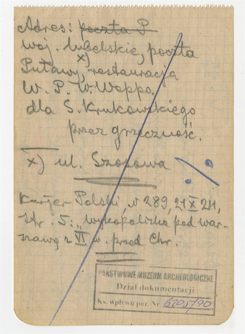 Rękopis - notatka "wś. Ossa młyn 9 IV 25 p. Piotr Kobuszewski przechowuje materiał w wydmy…" - druga strona przekreślony tekst "Adres: poczta P woj. Lubelskie…"