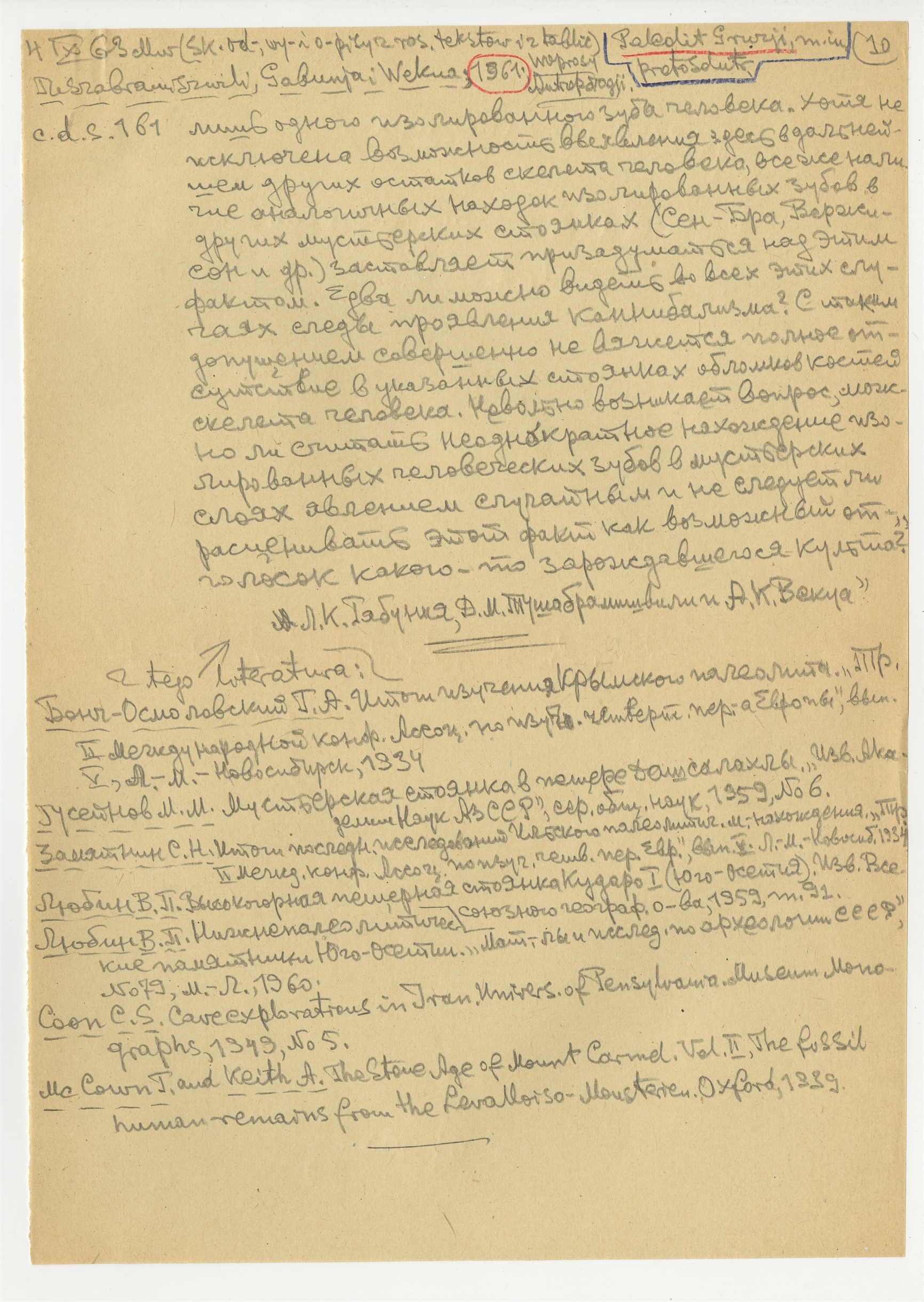 Element 10 - Rękopis - notatki i wypisy Stefana Krukowskiego z dnia 4 IX [19]63 roku dotyczące paleolitu Gruzji z publikacji rosyjskich. Strona 10