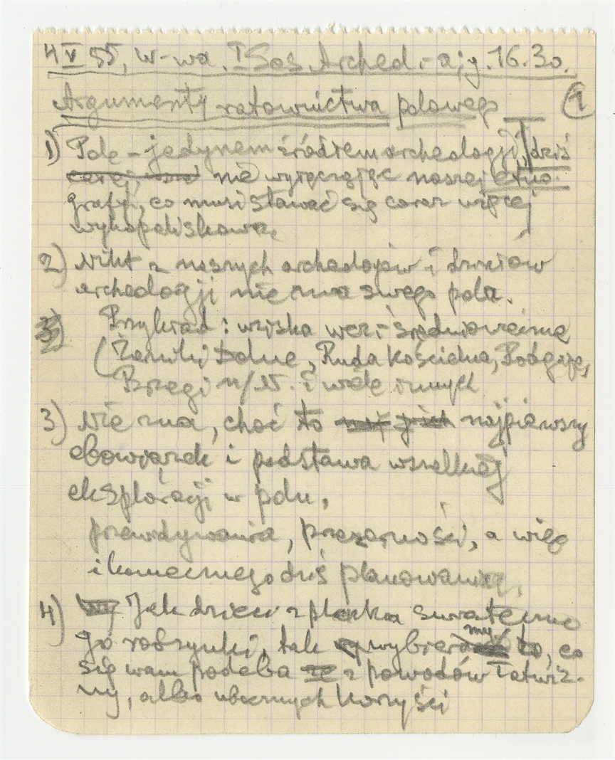Rękopis - notatki naukowe Stefana Krukowskiego "Warszawa I Sesja Archeologiczna" z dn. 4 V [19]55 r.