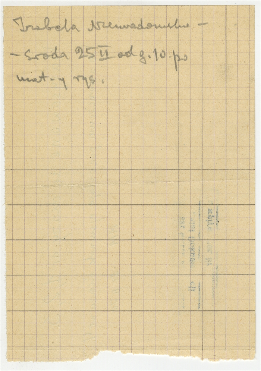 Rękopis notatki podpisany inicjałami MM (Marek Młynarski?) zatytułowany "Narysowane są okazy 1 2 3." - strona 1: zawiera krótką notkę - "Izabela Niewiadomska - środa 25 od g.10 po mat-y rys. (bez numeru strony)