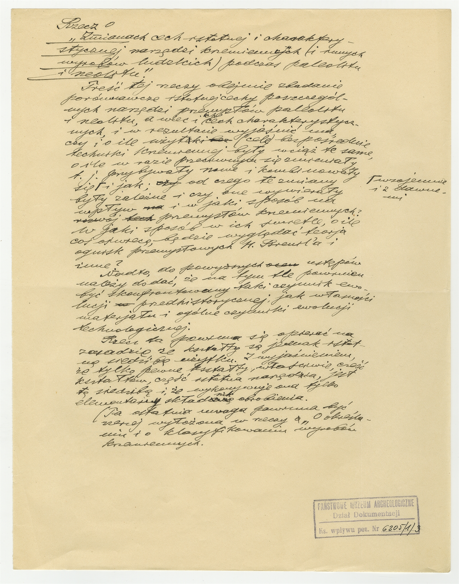 Rękopis notatki prof. Stefana Krukowskiego pt.: "Recz o zmianach cech istotnej i charakterystycznej narzędzi krzemiennych (i innych wyrobów ludzkich) podczas paleolitu i neolitu"