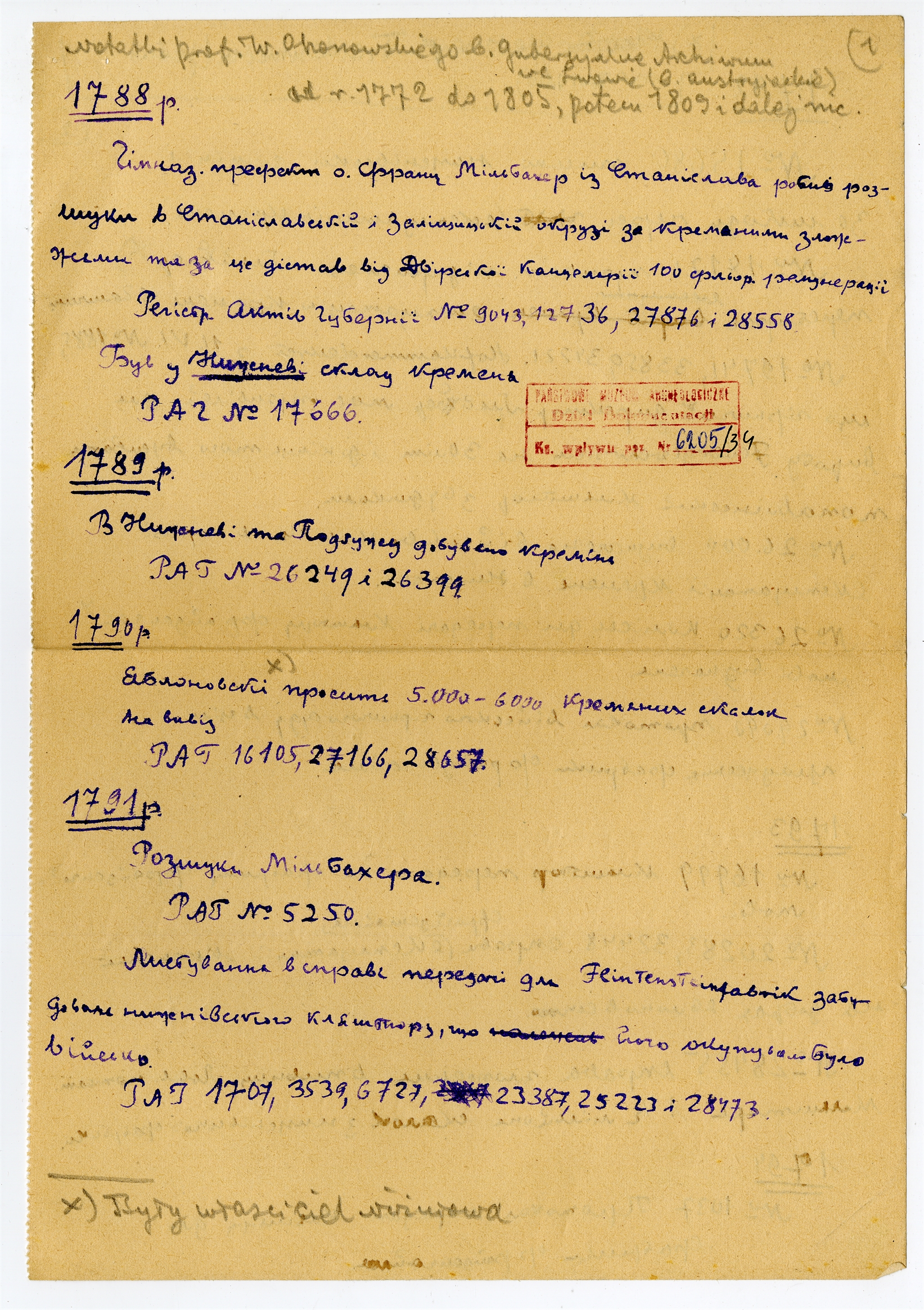 Rękopis - notatki prof. W. Ohonowskiego - wypisy zasobów Gubernialnego Archiwum we Lwowie. Ręką S. Krukowskiego komentarze do notatek i numeracja stron. Strona 1