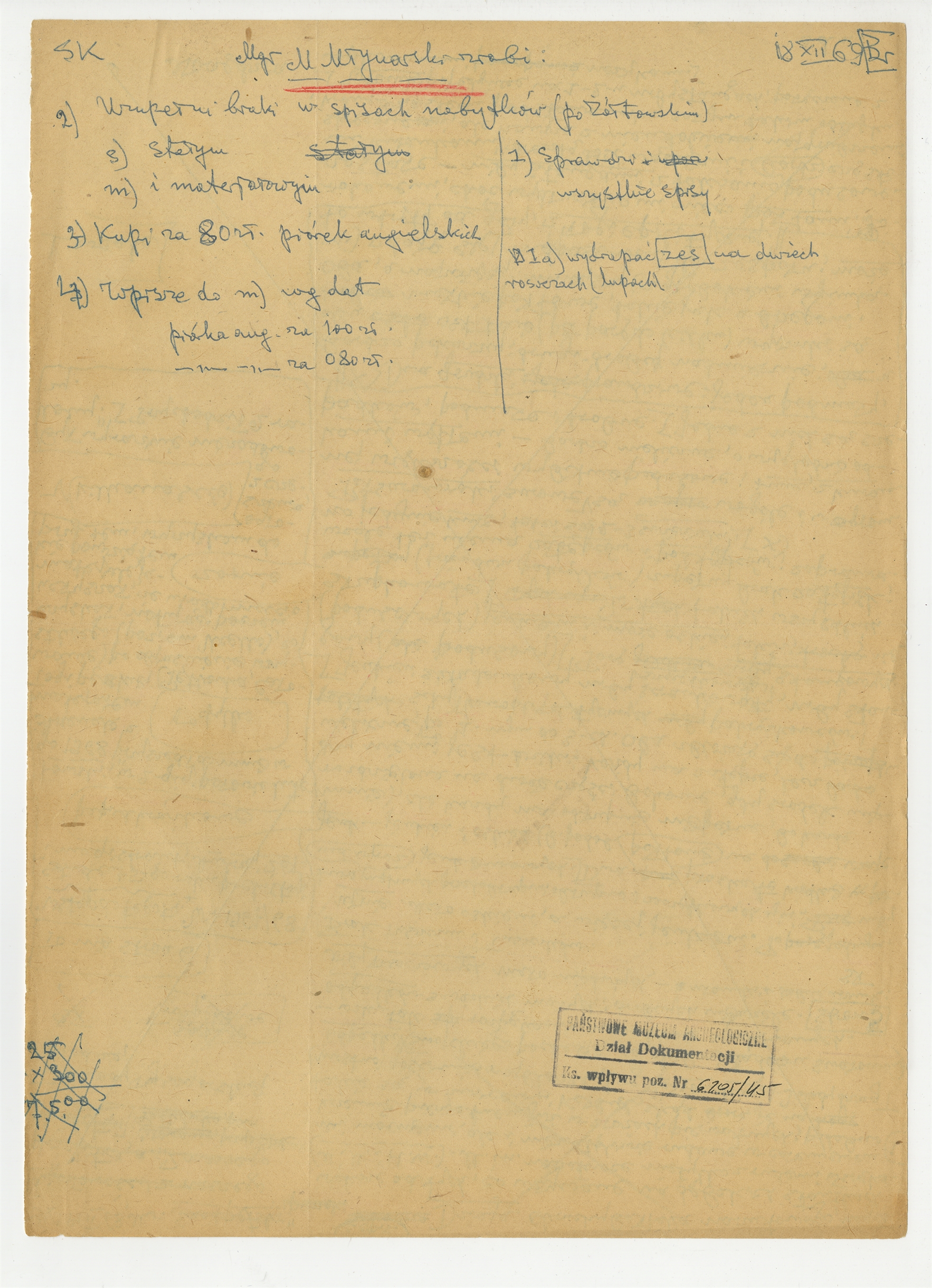 Rękopis notatki S. Krukowskiego dotyczący prac dla M. Młynarskiego - strona 1: zatytułowana "Mgr M Młynarski zrobi:" 18 XII [19]69 (bez numeru strony)
