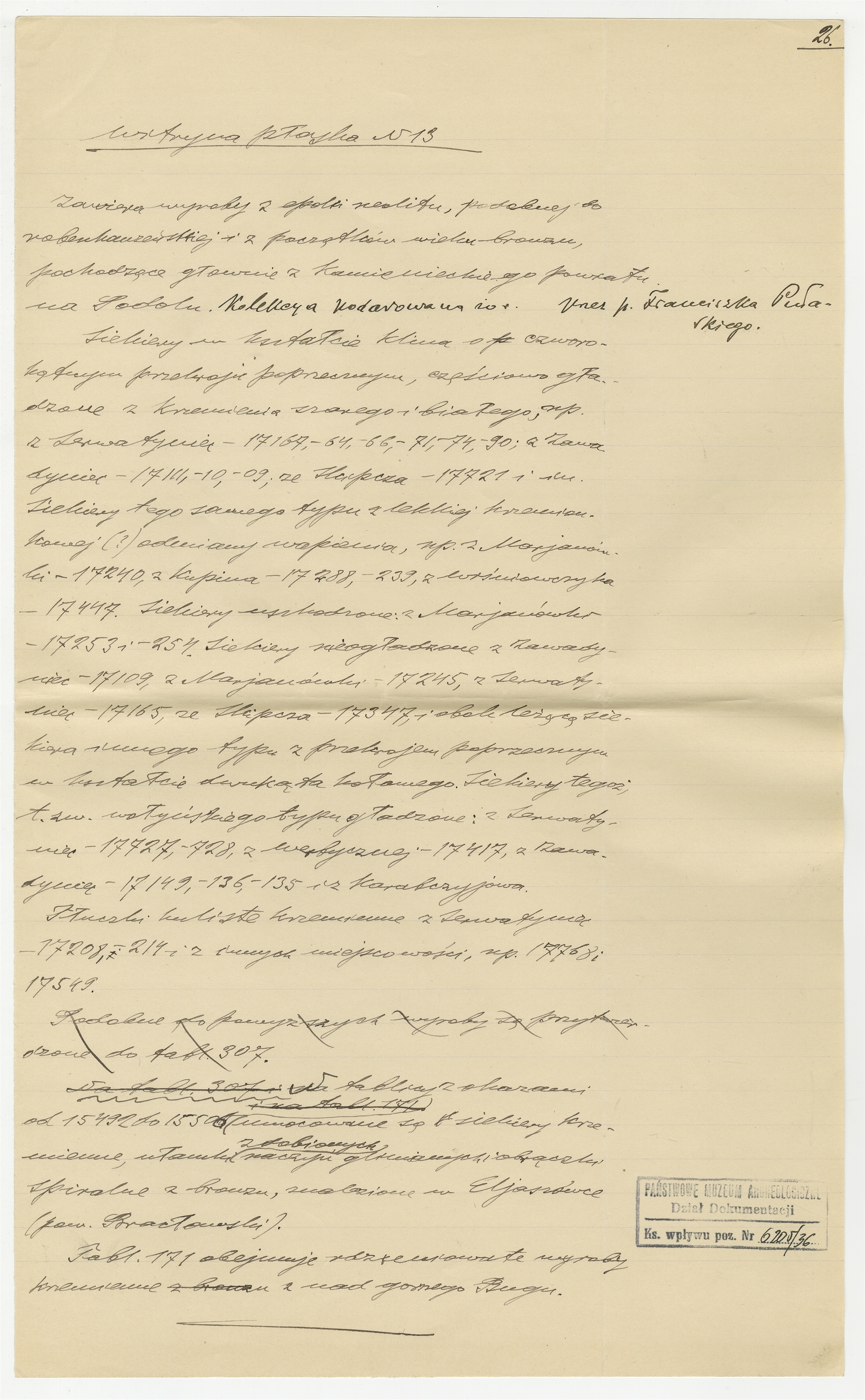 Rękopis - notatki Stefana Krukowskiego - "Materiały do Katalogu Muzealnego" - witryna płaska N13. Strona 26