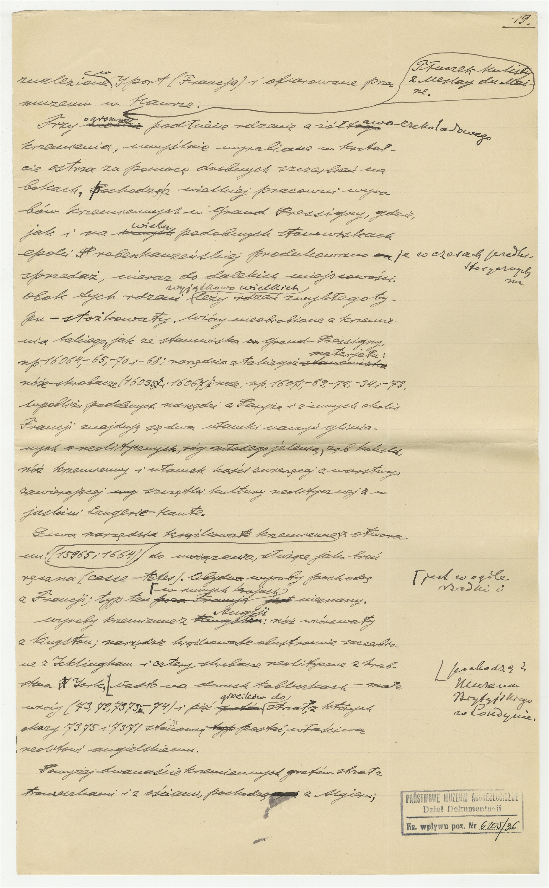 Rękopis - notatki Stefana Krukowskiego - "Materiały do Katalogu Muzealnego" - witryna płaska N5 (cd). Strona 19