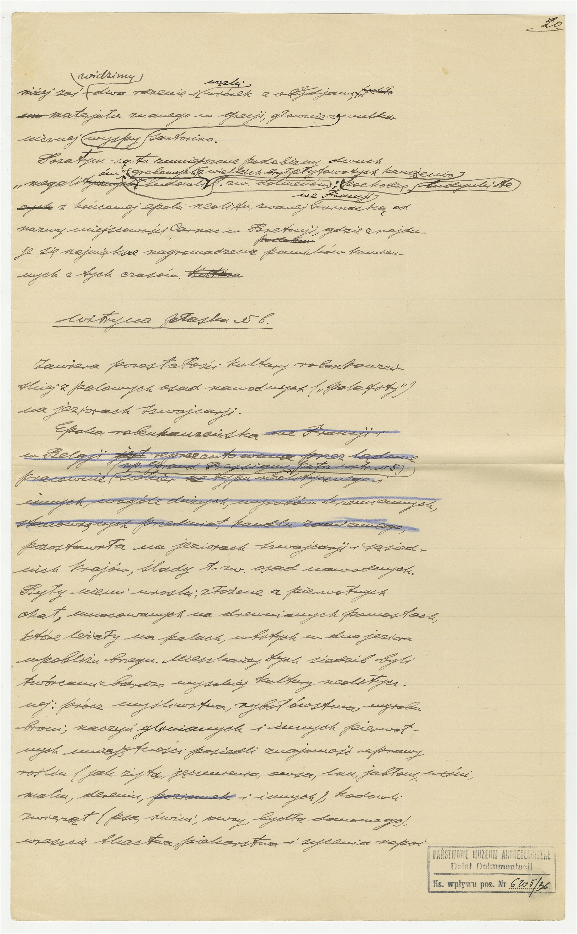 Rękopis - notatki Stefana Krukowskiego - "Materiały do Katalogu Muzealnego" - witryna płaska N5 (cd) witryna płaska N6. Strona 20