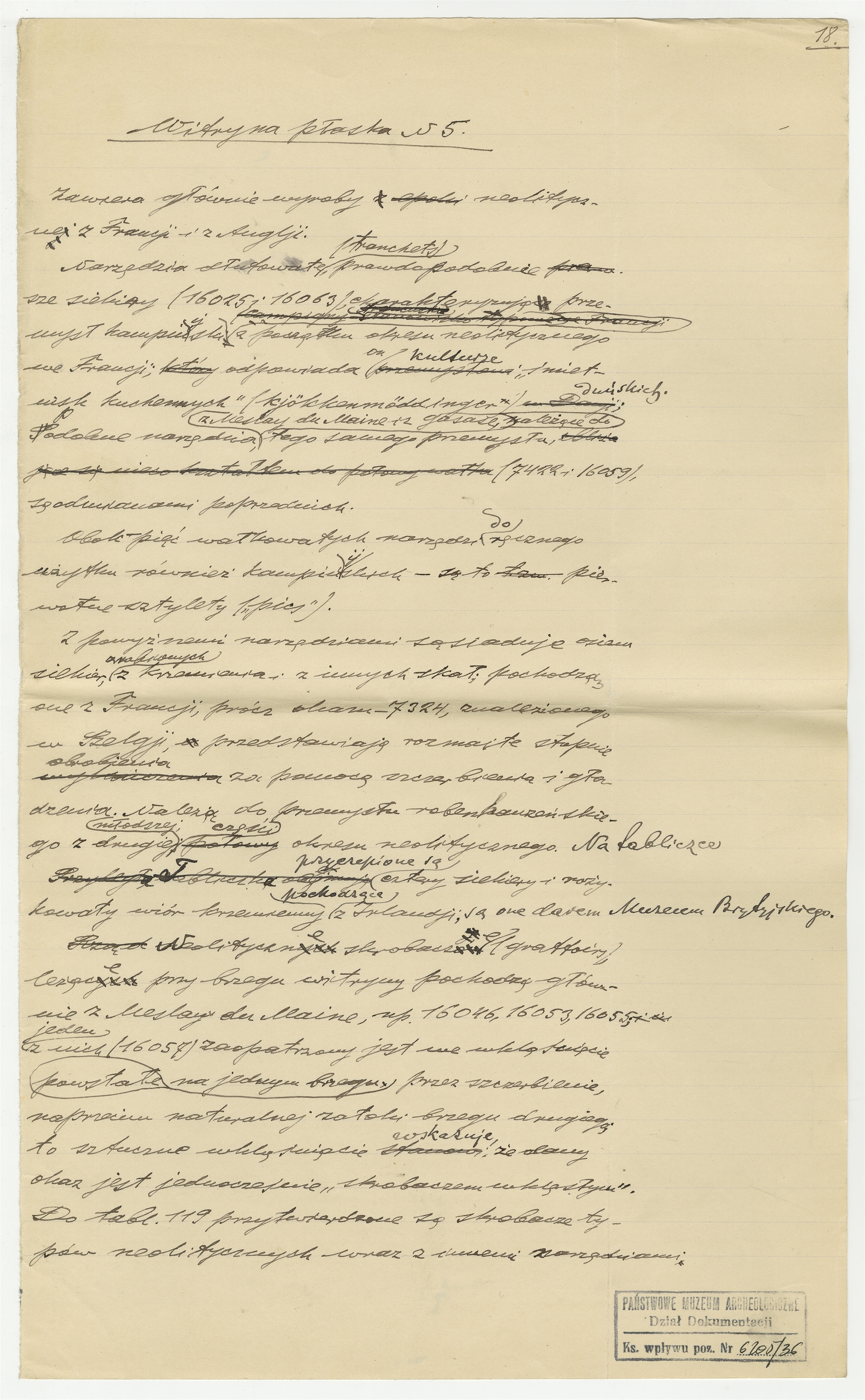 Rękopis - notatki Stefana Krukowskiego - "Materiały do Katalogu Muzealnego" - witryna płaska N5. Strona 18