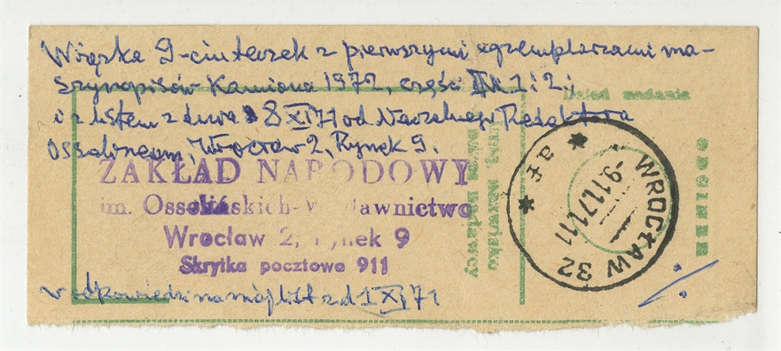 Rękopis - notatki Stefana Krukowskiego na pokwitowaniu odbioru przesyłki pocztowej z dn. 9 XI [19]71 r. - awers