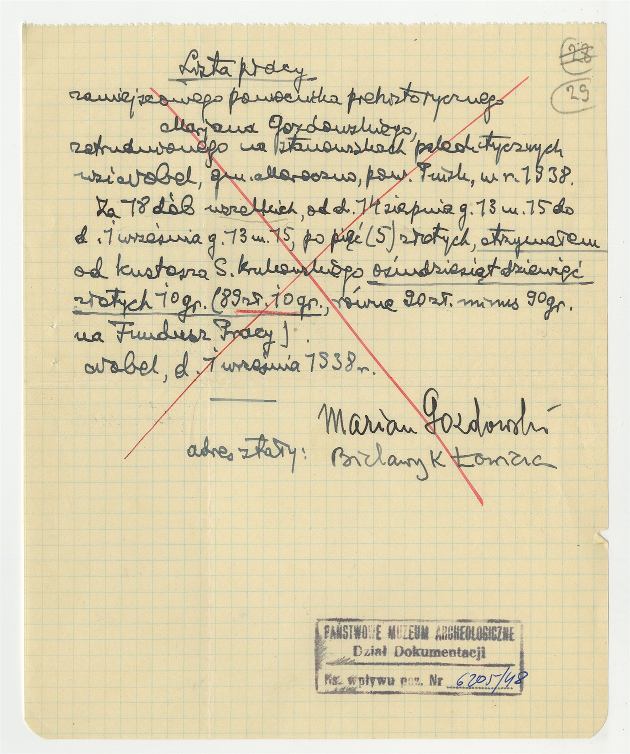 Rękopis notatki zatytułowanej "Lista płacy zamiejscowego pomocnika prehistorycznego Marjana Gozdowskiego zatrudnionego na stanowiskach paleolitycznych wsi Nobel gm. Moraczewo pow. Pińsk" - strona 1: "Za 18 dób" … "Bielany k. Łowicza" 1 września 1938