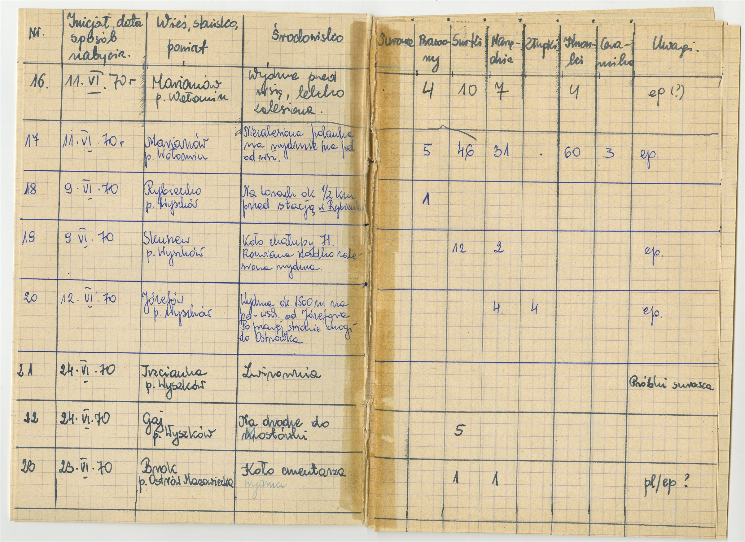 Rękopis notatnika sporządzony w zeszycie w kratkę zatytułowany "Zespół Prehistorii - badania terenowe 1970" - strona 5: inwentarz stanowisk w formie tabelki pozycje 16. (Marianów pow. Wołomin) - 23. (Brok p. Ostrów Mazowiecka) (bez numeru strony)