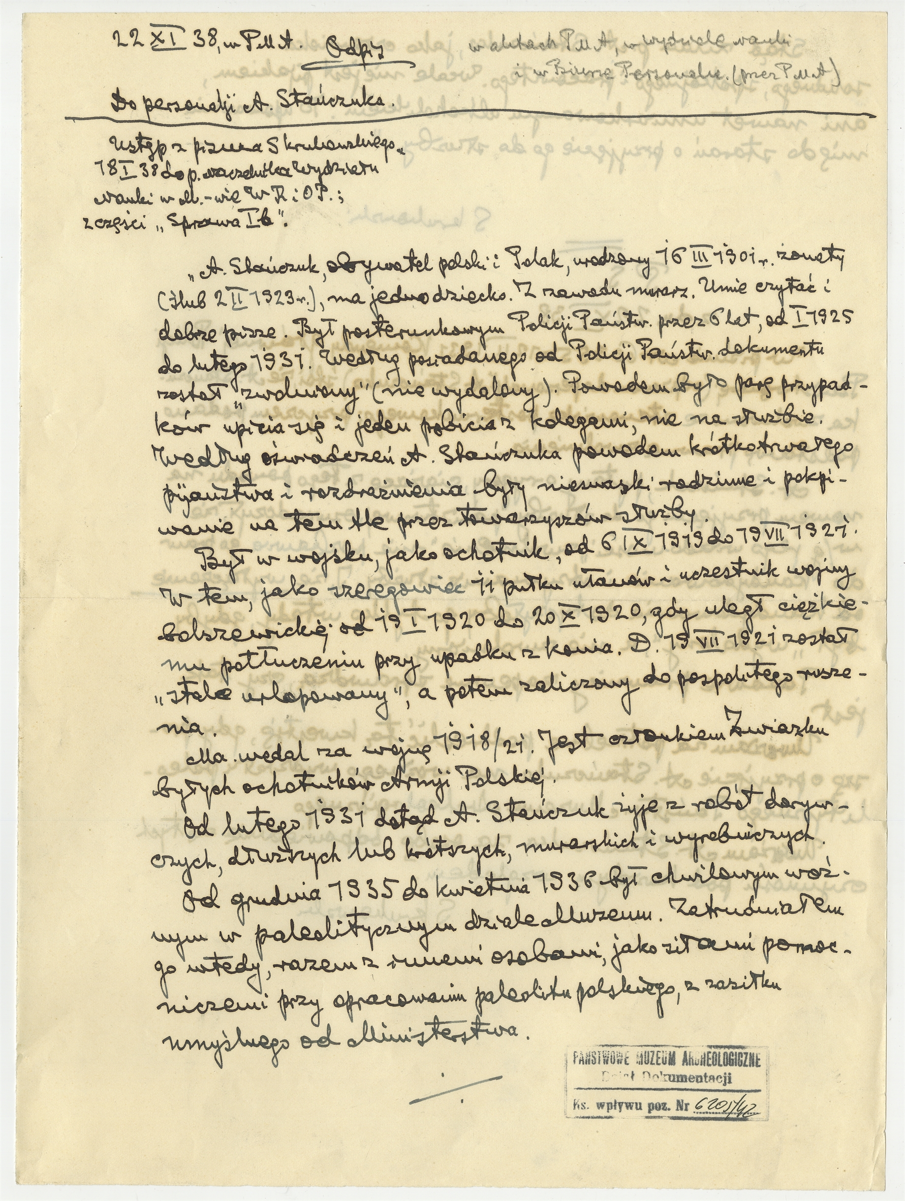 Rękopis - odpis fragmentu pisma Stefana Krukowskiego z dnia 18 I [19]38 roku do Naczelnika Wydziału Nauki w Ministerstwie W.R. i O.P. dotyczącego A. Stańczuka. Odpis z dnia 22 XI [19]38 roku
