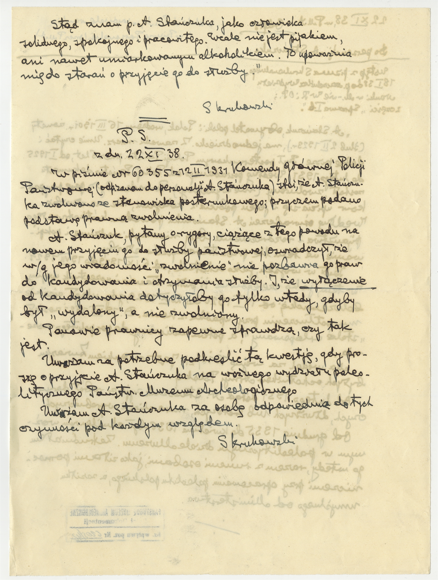 Rękopis - odpis fragmentu pisma Stefana Krukowskiego z dnia 18 I [19]38 roku do Naczelnika Wydziału Nauki w Ministerstwie W.R. i O.P. dotyczącego A. Stańczuka uzupełniony dopiskiem z dnia 22 XI [19]38 roku