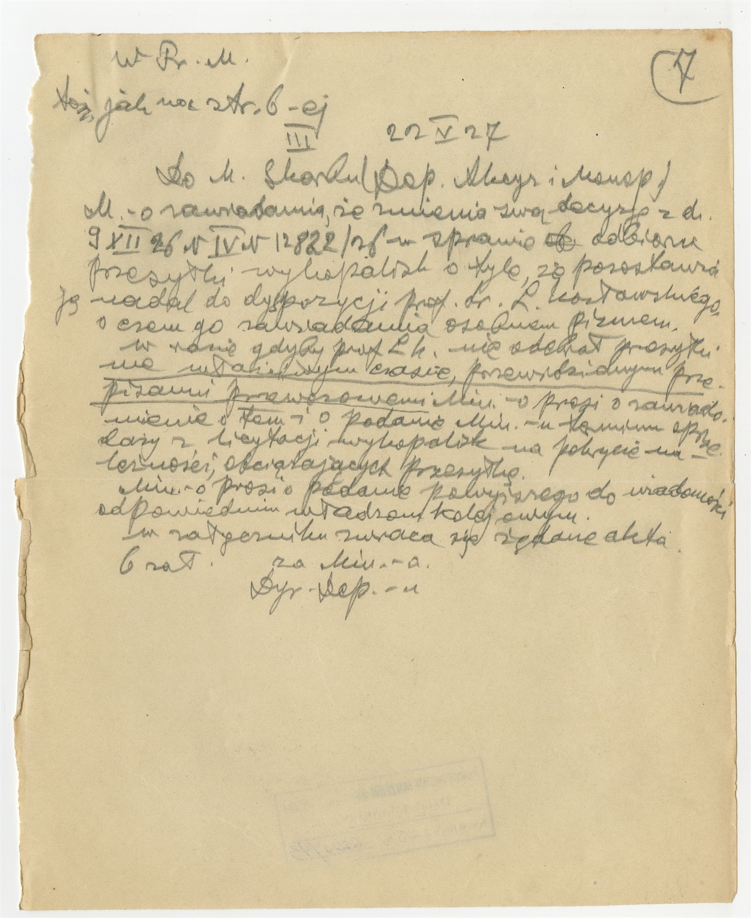 Rękopis - odpis listu Ministerstwa W. R i O.P do Ministerstwa Skarbu z dnia 22 V 1927 roku. Strona 7