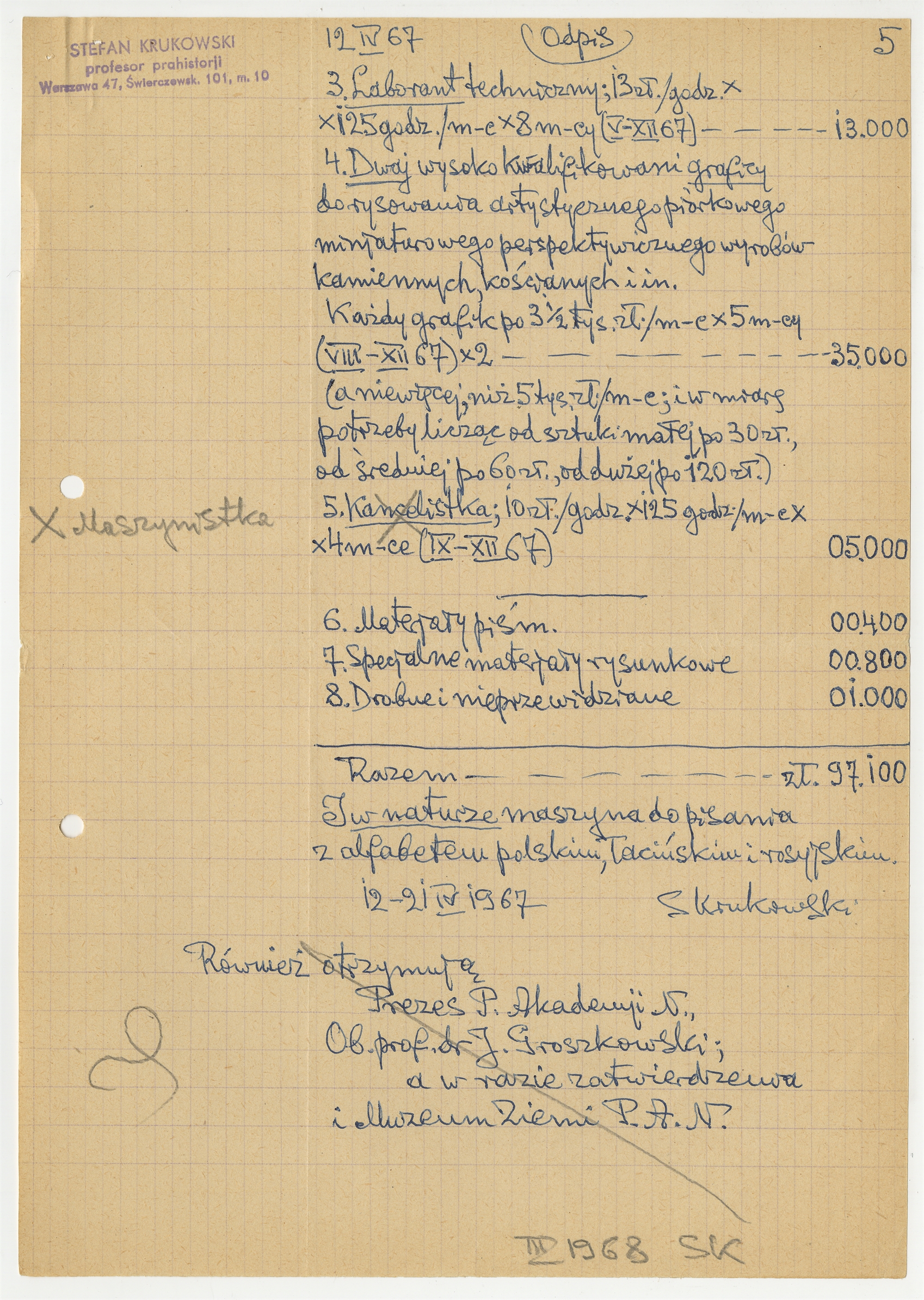 Rękopis - odpis listu S. Krukowskiego "Projekt dla mnie na IV-XII 1967 r." skierowany do W. Nowackiego Sekretarza Naukowego PAN z dn. 12 IV 1967 r. Strona 5