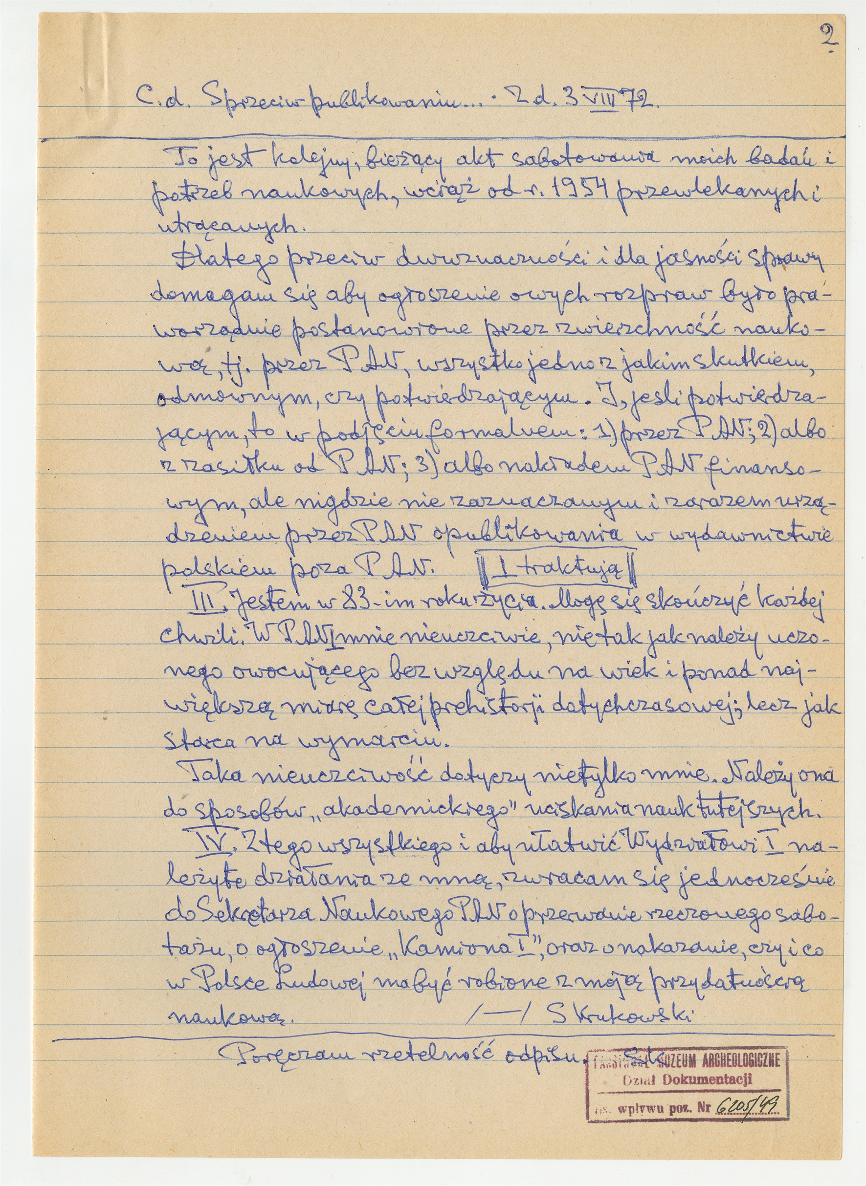 Rękopis - odpis listu (sprzeciw) Stefana Krukowskiego do Wydziału I PAN z dn. 3 VIII 1972 r. (cd)