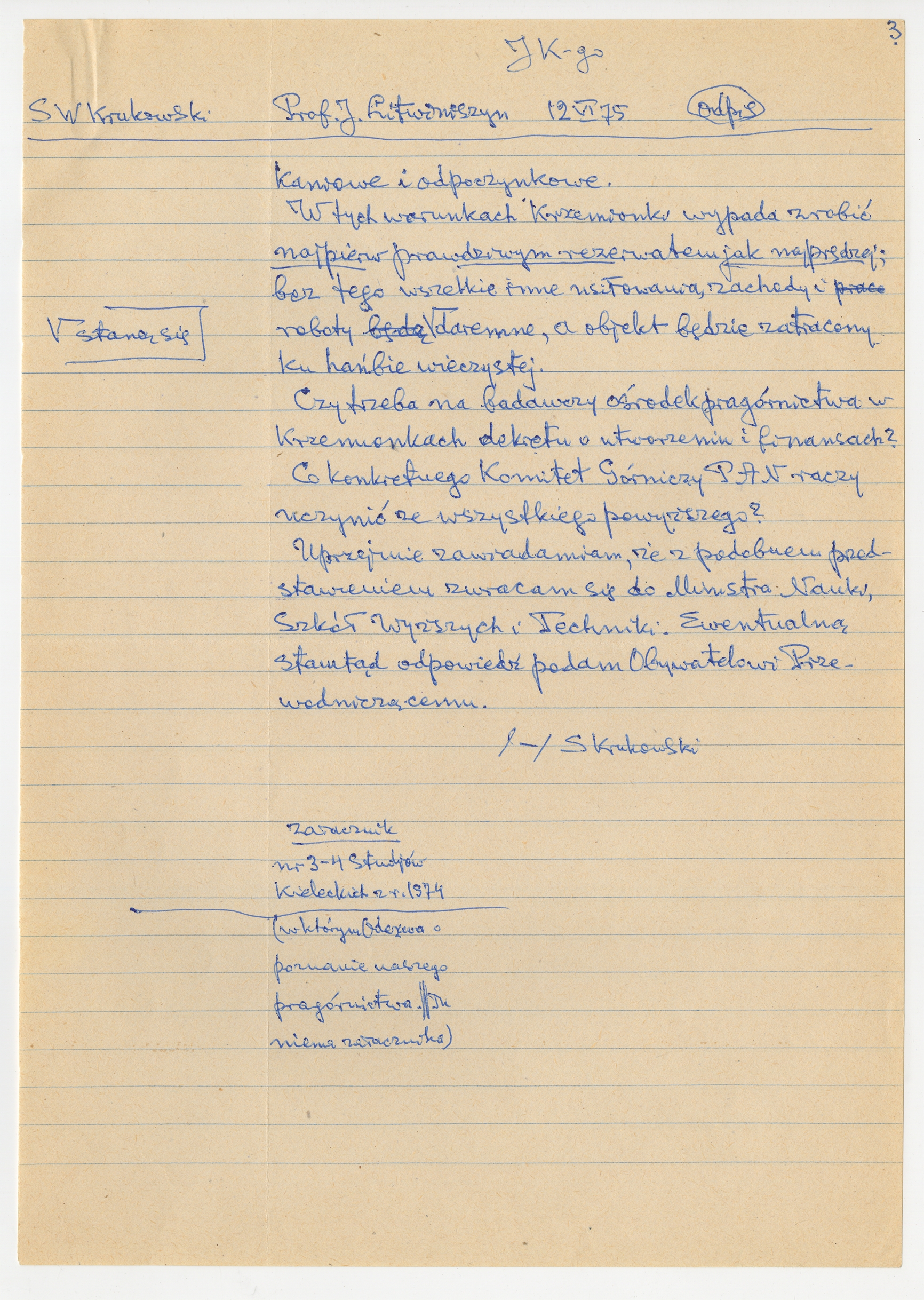 Rękopis - odpis listu Stefana Krukowskiego do Jerzego Litwiniszyna przewodniczacego Komitetu Górnictwa PAN z dnia 12 VI 1975 roku strona 3