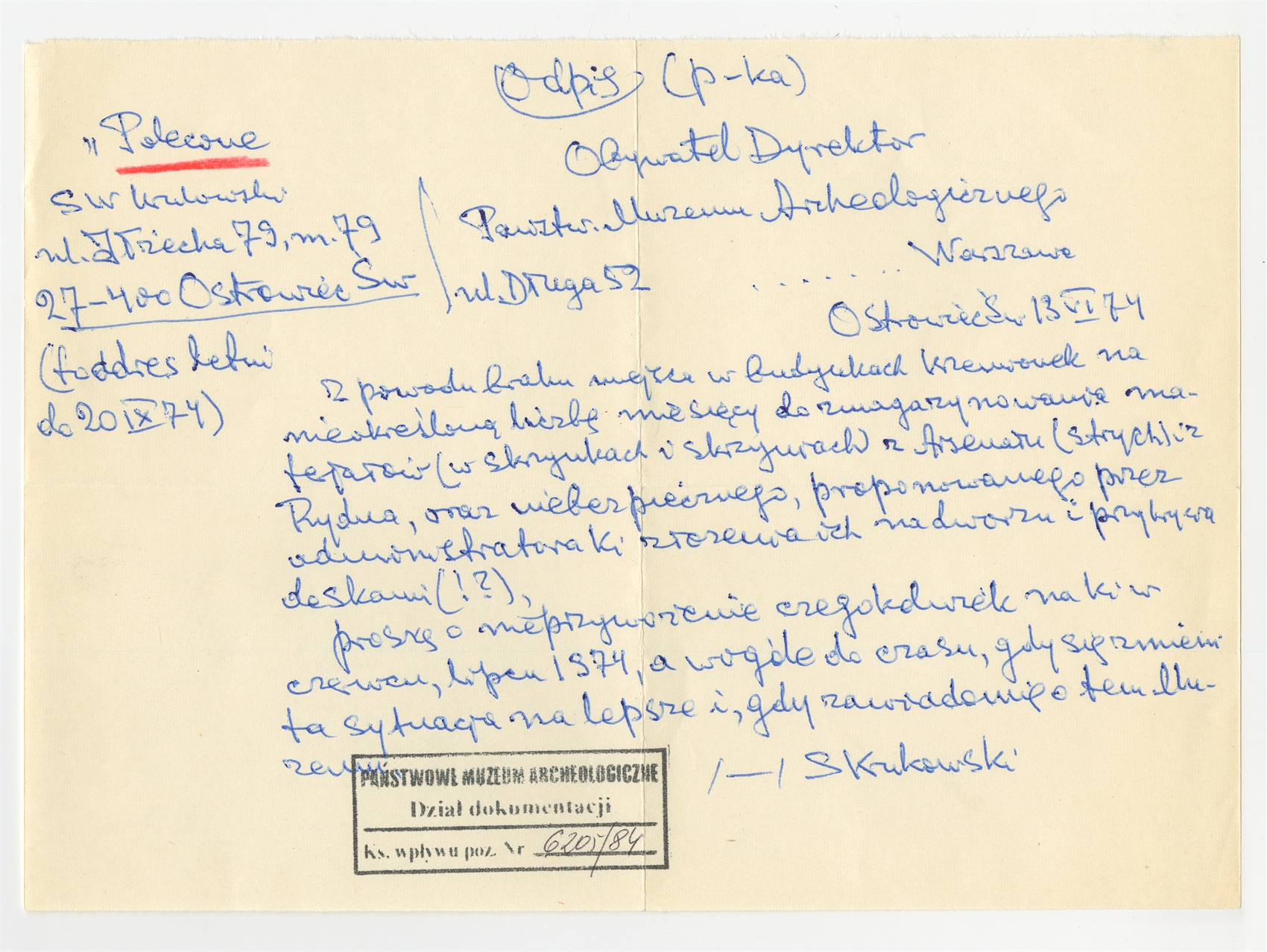 Rękopis - odpis listu Stefana Krukowskiego z dnia 13 VI [19]74 roku do Dyrektora Państwowego Muzeum Archeologicznego w Warszawie