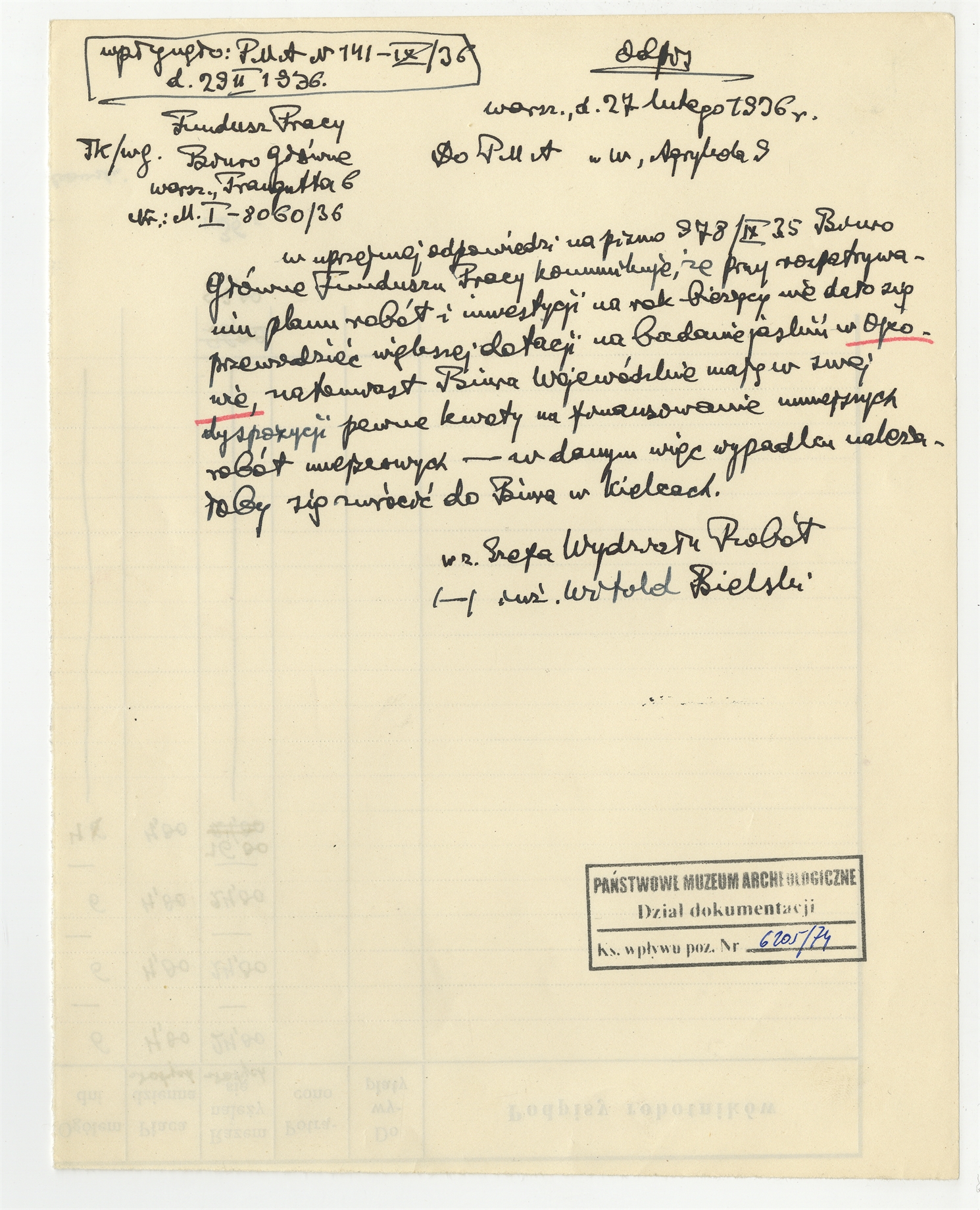 Rękopis - odpis listu z Biura Głównego Funduszu Pracy z dnia 27 lutego 1936 roku do Stefana Krukowskiego