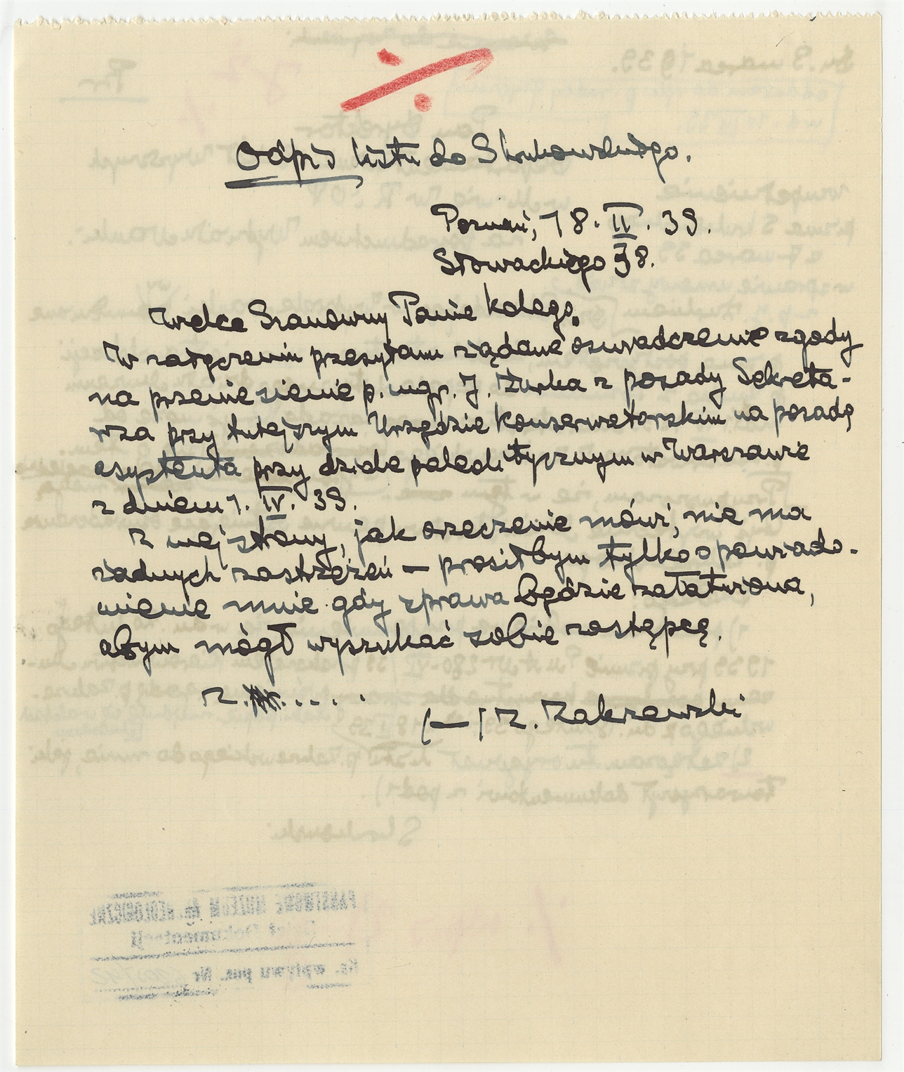 Rękopis - odpis listu Z. Zakrzewskiego do Stefana Krukowskiego z dnia 18 II [19]39 roku w sprawie Jana Żurka