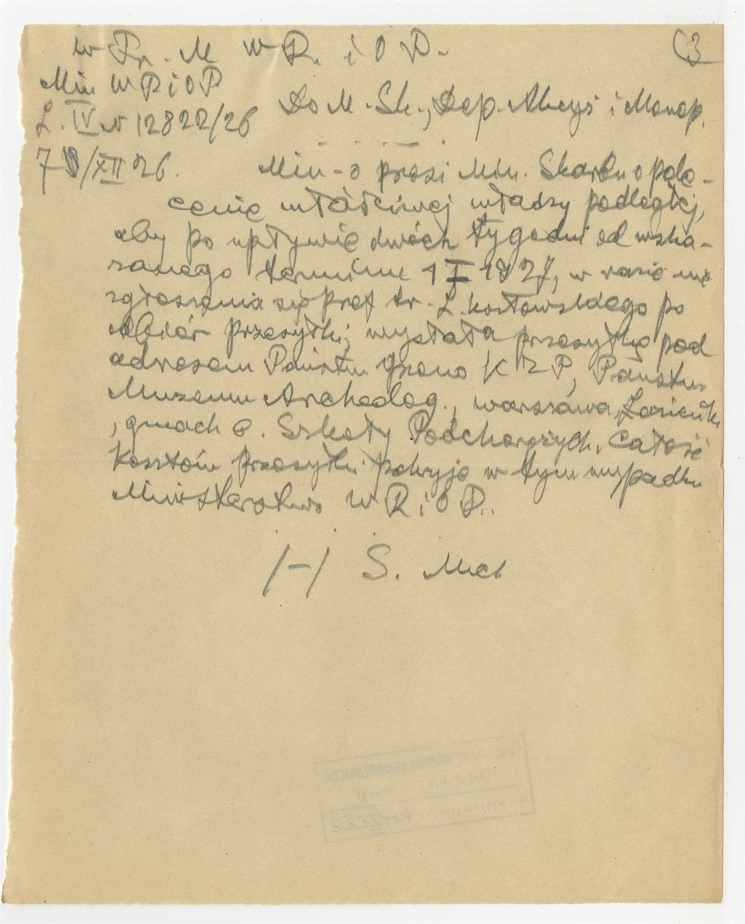 Rękopis - odpis pisma Ministerstwa W. R i O.P. do Ministerstwa Skarbu Dep. Akcyz i Monop. z dnia 7 XII 1926 roku. Strona 3