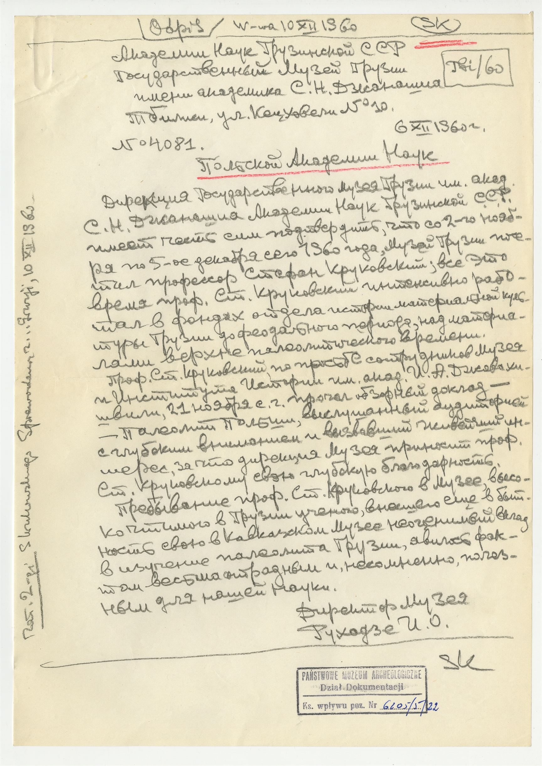Rękopis - odpis pisma (nr 4081) dyrektora Państwowego Muzeum Gruzji z dnia 6 XII 1960 roku do Polskiej Akademi Nauk