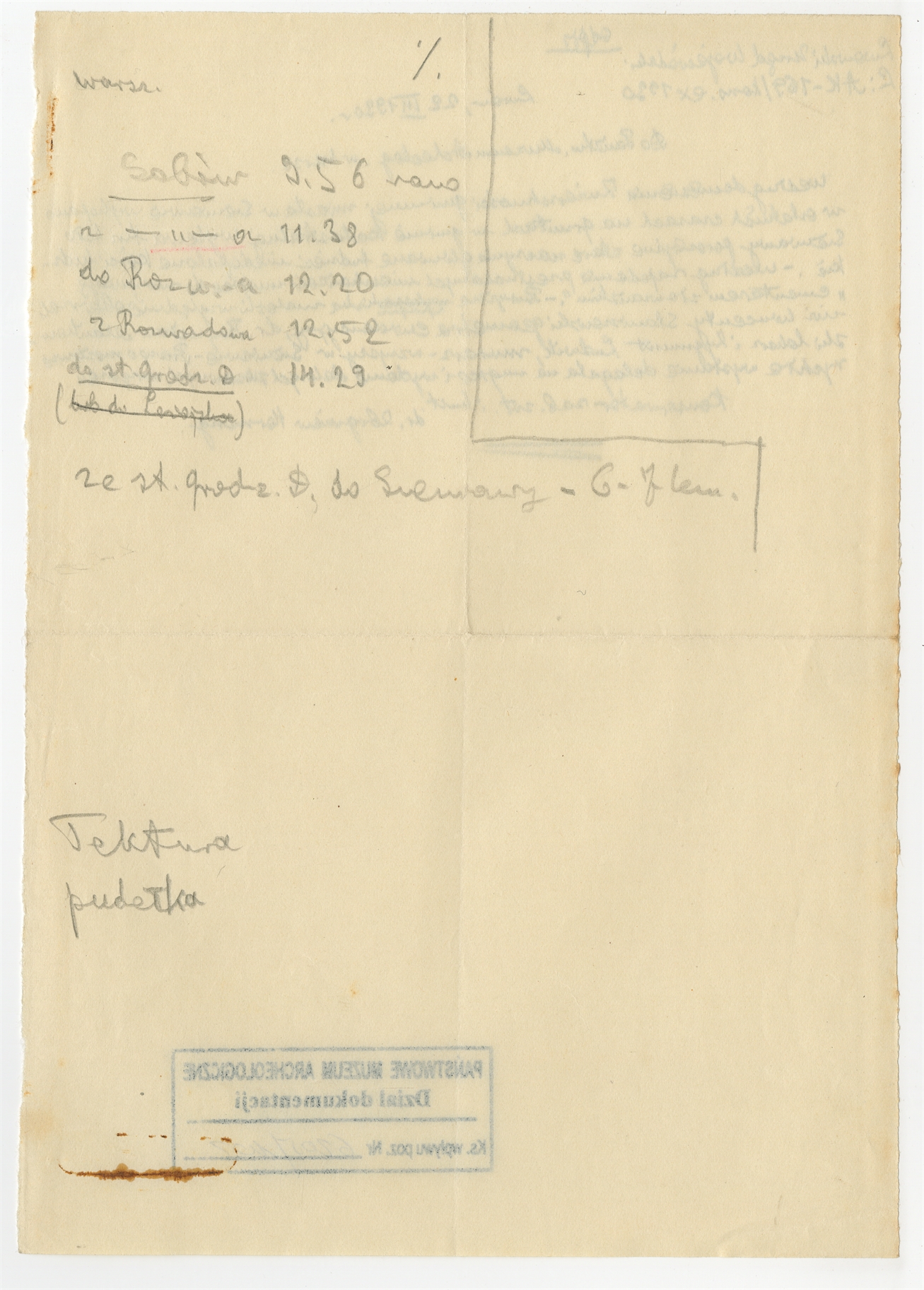 Rękopis - odpis pisma (o sygnaturze AK-169/kons. Ex 1930) Konserwatora Zab. Szt. i Kult. dr Zbigniewa Karnunga do Państwowego Muzeum Archeologicznego w Warszawie w sprawie znalezisk dokonanych na gruntach w gminie katastralnej Wylewo koło Sieniawy - strona 2: zawiera notatkę sporządzoną przez S. Krukowskiego odnośnie połączeń i możliwości dojazdu z Warszawy do Sieniawy "Sobów 9 56 rano" ... "Tektura pudełka"