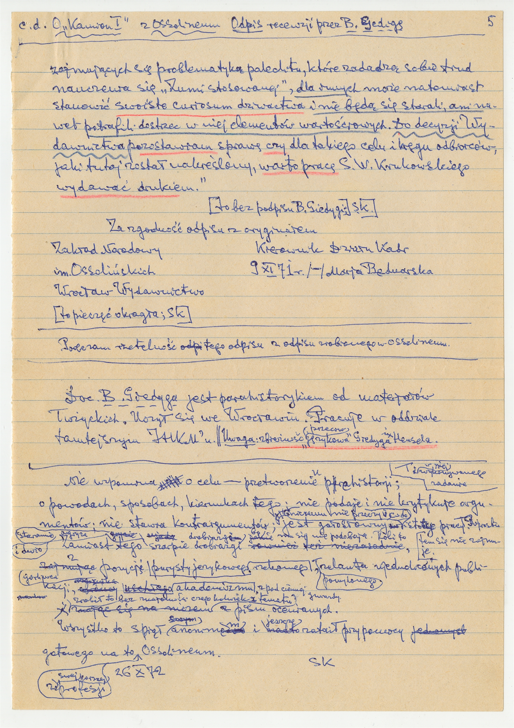 Rękopis - odpis recenzji B. Gedigi (cd);notatki Stefana Krukowskiego dotyczące tejże recenzji z dn. 26 X [19]72 r.