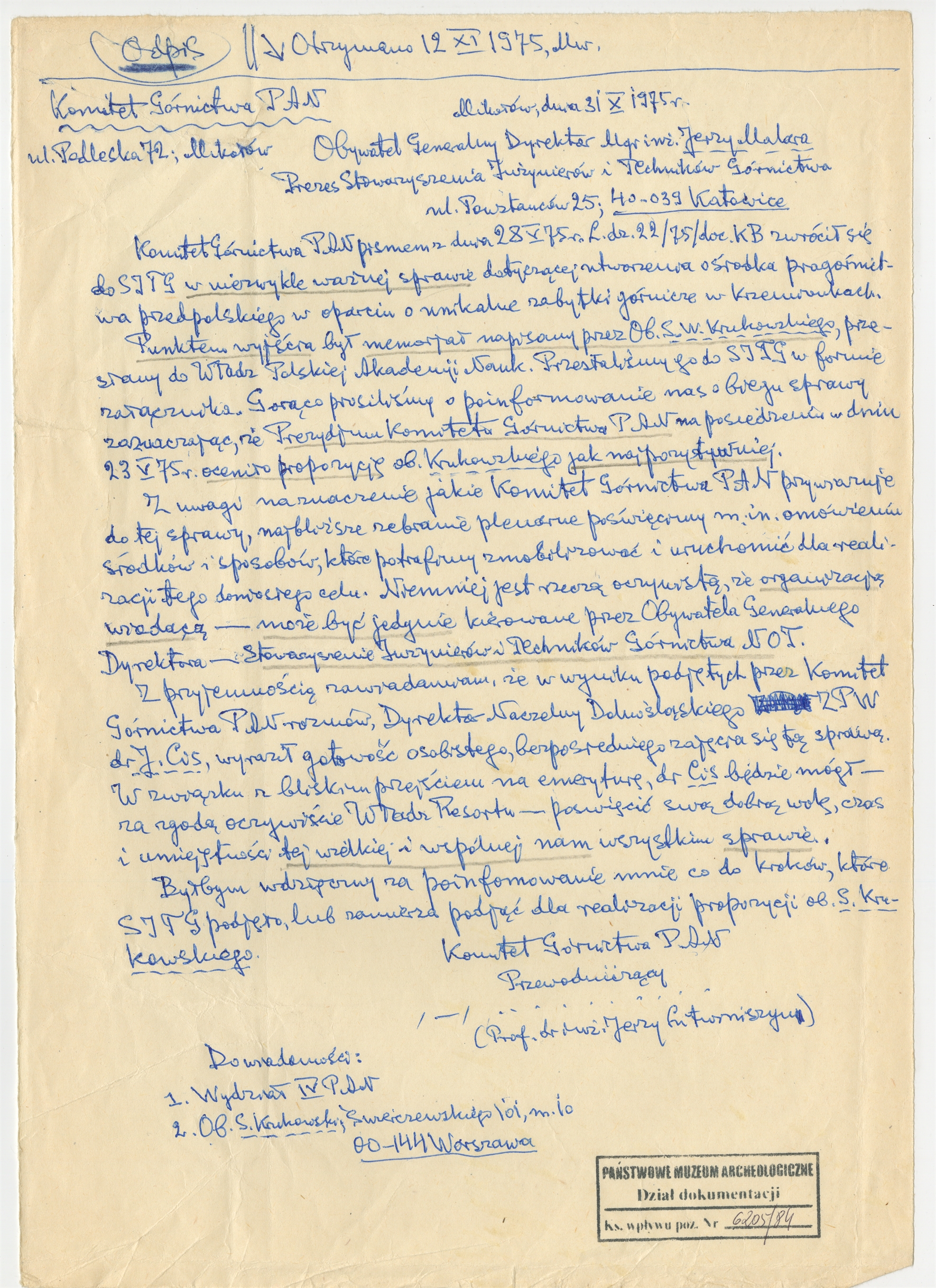 Rękopis - odpis ręką S. Krukowskiego listu Jerzego Litwiniszyna przewodniczącego Komitetu Górnictwa PAN do Jerzego Malary Prezesa SITG z dnia 31 X 1975 roku